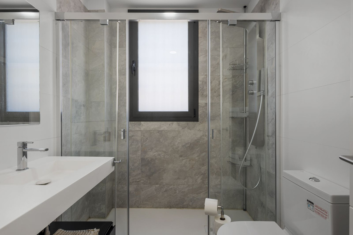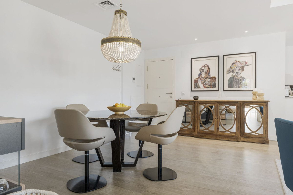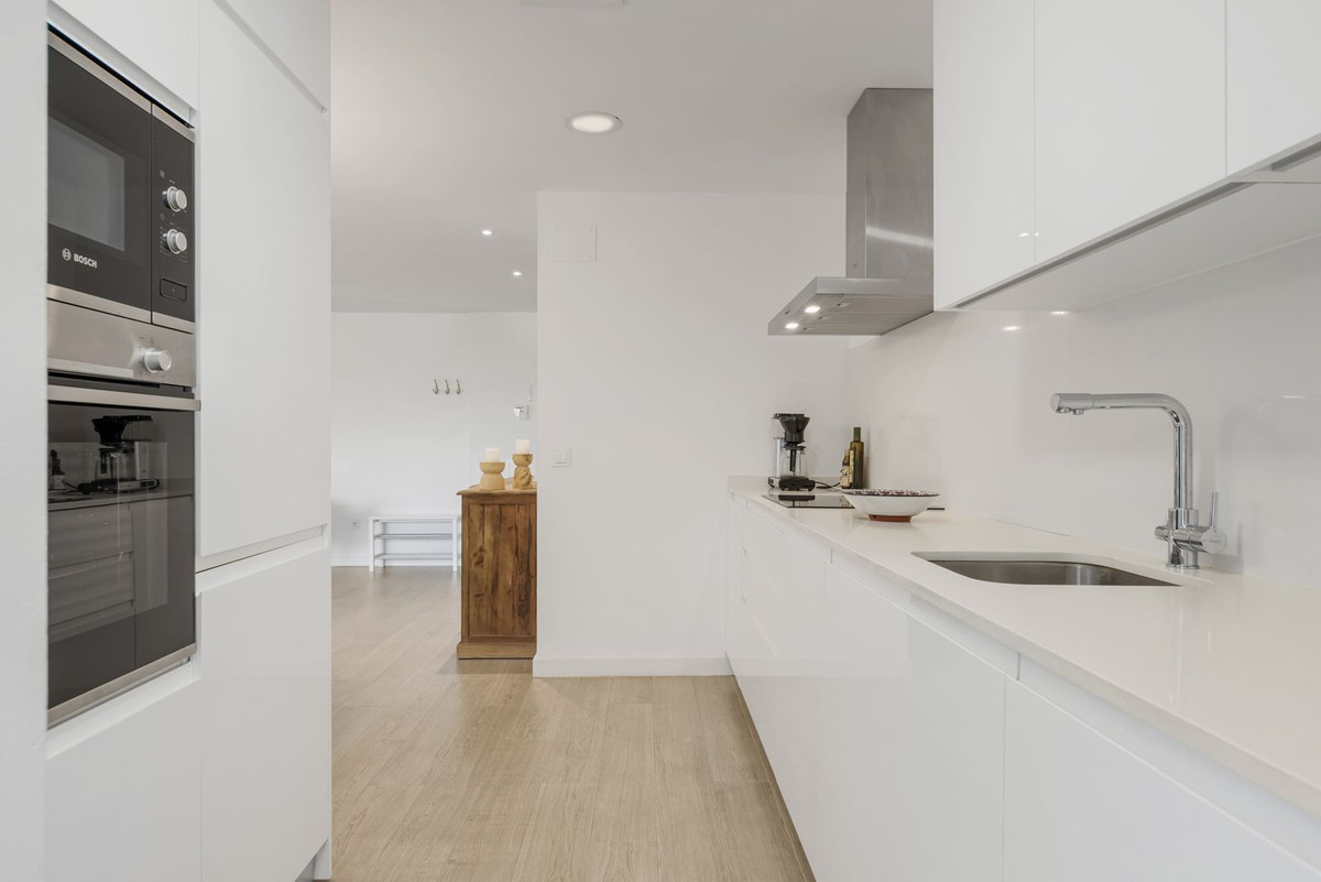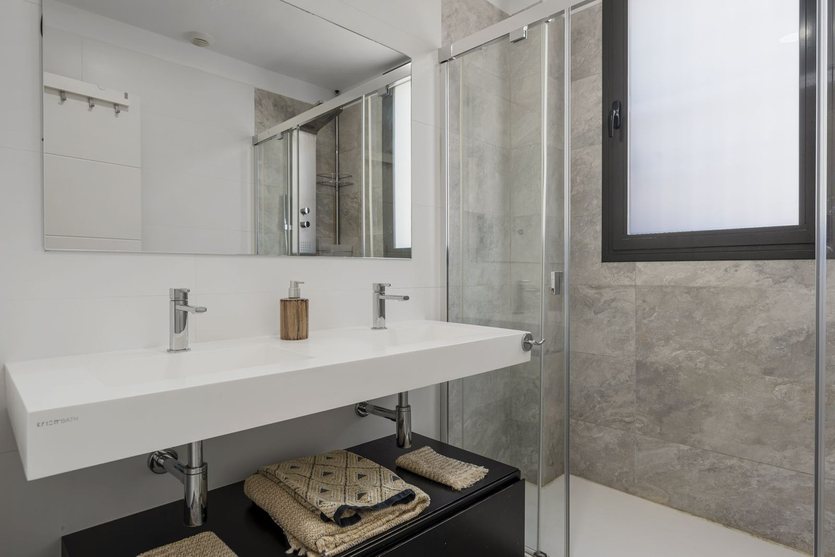 Entrance into the large open plan living, dining room and kitchen with utility with access to the east facing terrace from the living area, and conveniently also from the kitchen which is modern and highly equipped. The property has three large double bedrooms, the master bedroom is en suite with walk in shower and double sinks, the two other bedrooms share a spacious main bathroom with bath and double sinks and they both have access to the south facing main terrace.