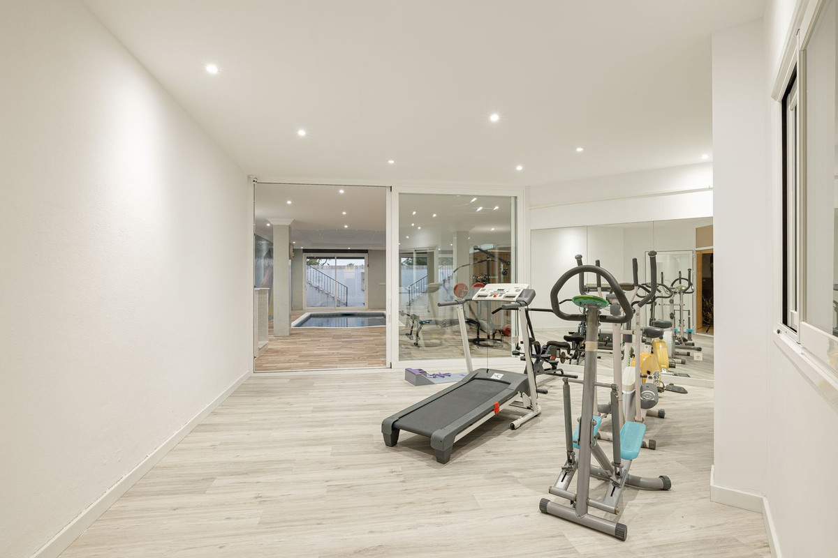 The outdoor area is nothing short of spectacular, featuring a vast swimming pool with a unique beach-style entrance that evokes the feeling of a private resort. Indoors, the villa offers a heated swimming pool alongside a luxurious spa and a fully equipped gymnasium, creating a haven for relaxation and wellness.