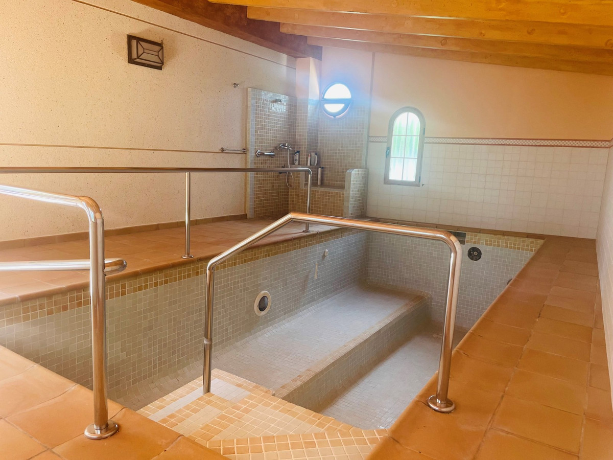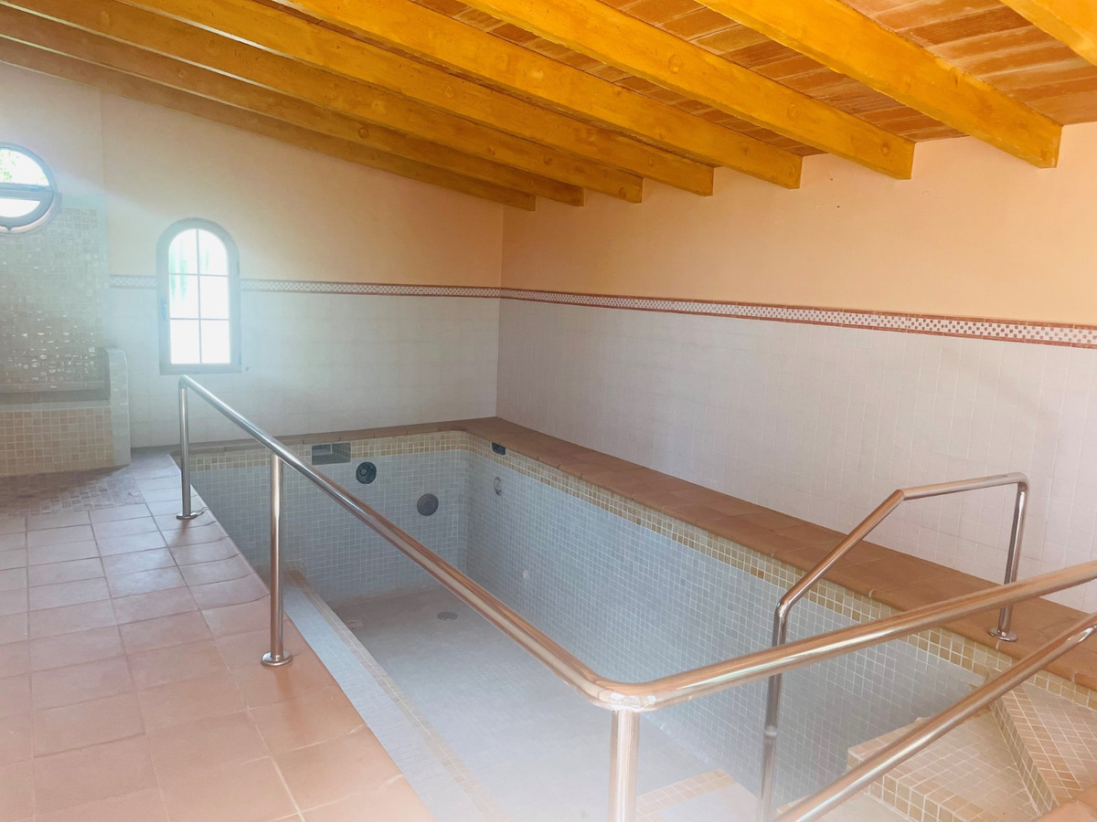 On the ground floor there is a spacious kitchen, dining room, large living room, 2 bedrooms and 2 bathrooms, a games area that can be used as a gym. On the same floor there is a heated swimming pool equipped with hydromassage jets, a shower with a staircase built with traditional handmade tiles. From the same living room there is access to the large terrace, which has a swimming pool, fountains and a beautiful garden. In this area there are also the two closed garages and the barbecue area with its own kitchen.