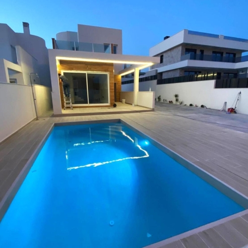 Layout villa:On the second floor there is an open kitchen with a spacious living and dining room that offers direct access to the terrace with beautiful views. Here are also three bedrooms, including a master bedroom with en-suite bathroom equipped with shower and whirlpool tub, plus an additional bathroom with tub.