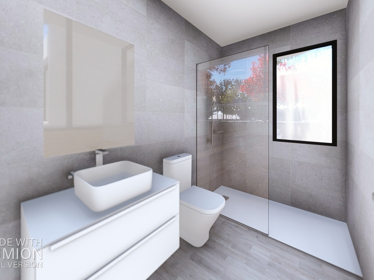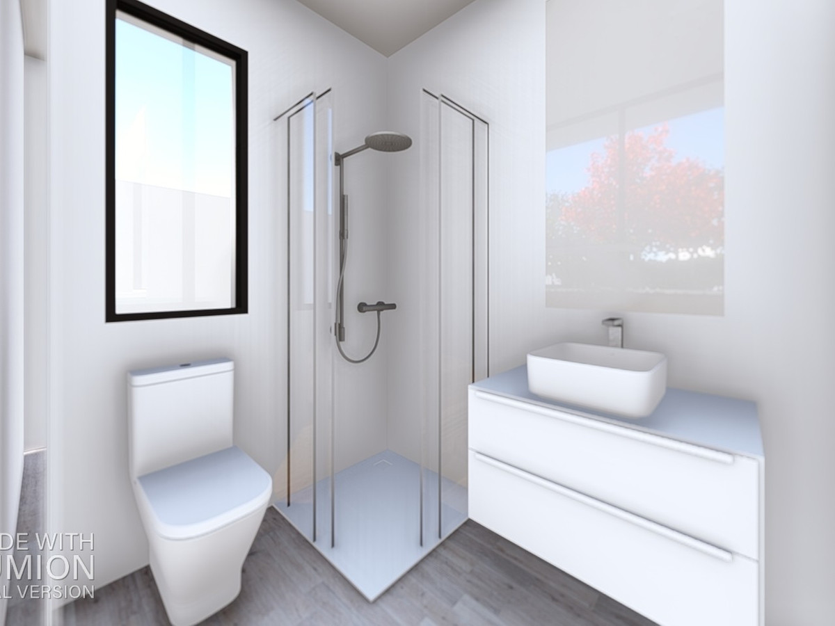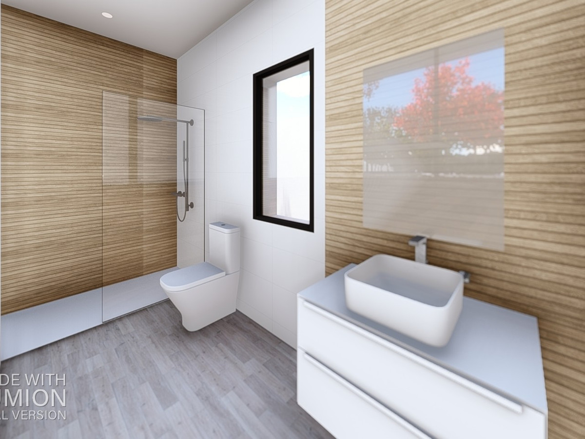 Rectified porcelain tile glued with adhesive will be placed in the interior, exterior and bathrooms. See the dossier Porcelanosa