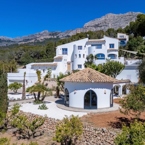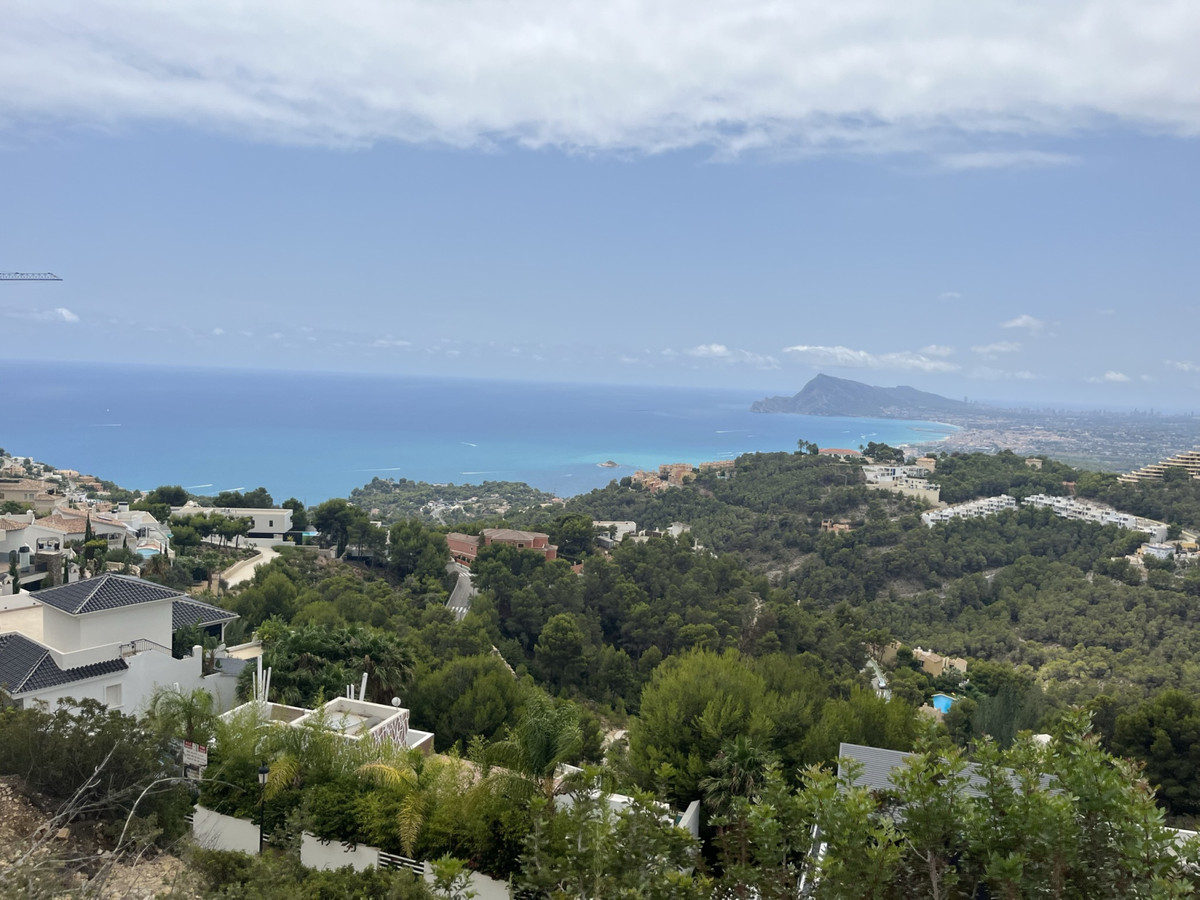 The villa features ultra-modern architecture. Every room, bathroom, living room, dining room, and kitchen offers panoramic views of the Mediterranean Sea, Altea, and Benidorm. The house spans three floors connected by a glass elevator and an impressive staircase.