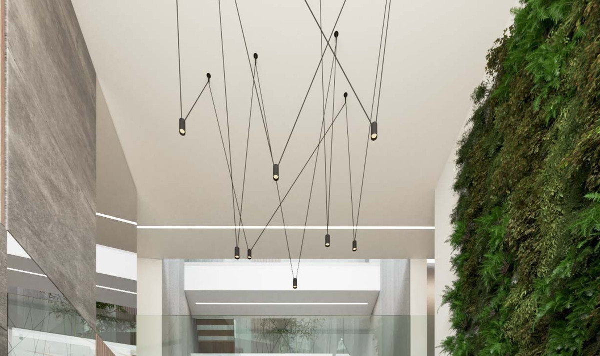 Level 3 houses the master bedroom, which includes two large walk-in closets, a bathroom with a shower and bathtub, and a separate toilet. The living room is connected to the dining area and the kitchen, behind which there is a large pantry. All rooms on this level feature expansive glass walls. The foyer also has a guest bathroom.
