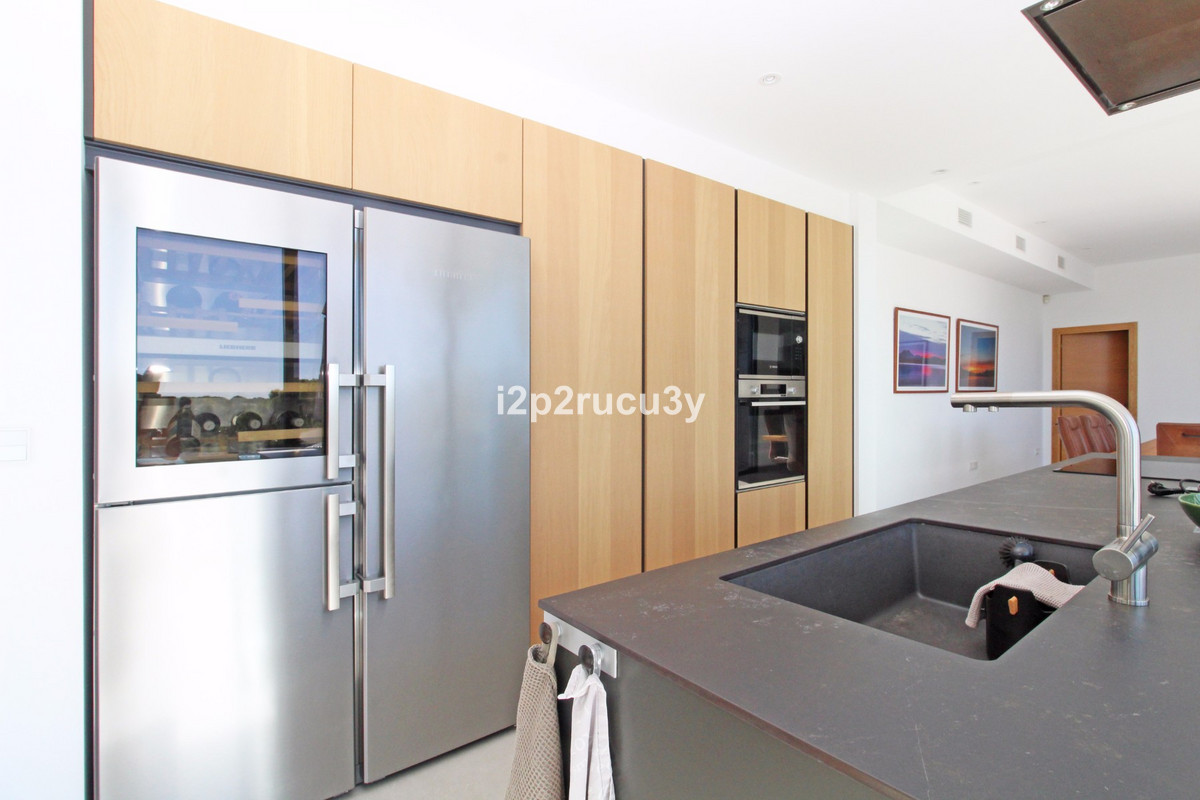An elegant open staircase leads to the upper level, where you will find two additional bedrooms that share a modern bathroom, as well as a third bedroom with its own private ensuite bathroom. All the bedrooms have direct access to a large terrace, perfect for enjoying the panoramic views, and each bedroom is fitted with automatic shutters for convenience and privacy.