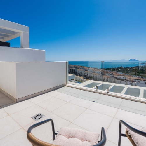The first floor is home to three bedrooms and one bathroom. All bedrooms have balcony doors, are bright, and have excellent views. The main bedroom has a walk-in wardrobe and a balcony, is south-facing and has stunning views of the sea and across to the vineyards and mountains. The second bedroom has fitted wardrobes, a Juliet balcony and also has amazing sea views. The family bathroom has been refurbished and is modern with a walk-in shower. Even from here, there are stunning mountain views to the mountain range, Sierra Bermeja. The third bedroom is a double bedroom with fitted wardrobes and a private terrace. The views are beautiful over the pool, across the vineyards and to the sea.