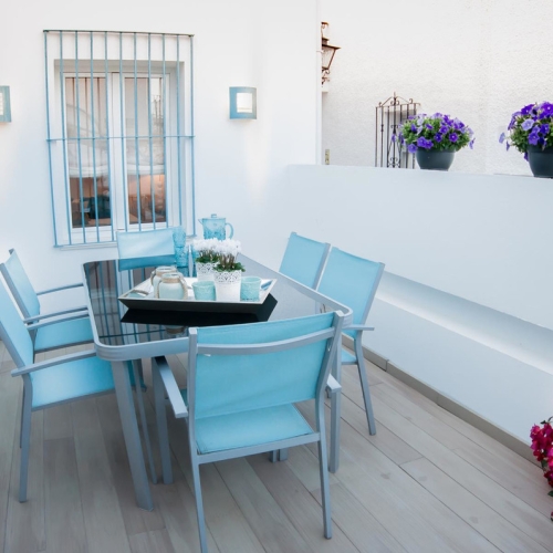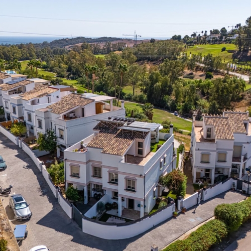 The home combines functionality with charm, offering a fully fitted kitchen, marble flooring, air conditioning, and double-glazed windows. A private roof terrace and additional outdoor spaces provide ample room for relaxation and entertaining. This is an ideal property for those seeking a well-positioned home in a secure and established community on the Costa del Sol.