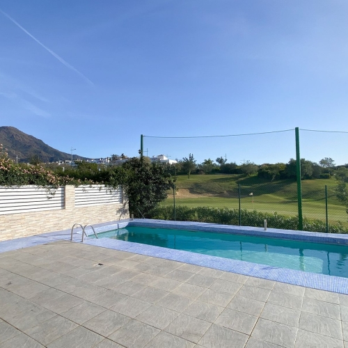 Set within a secure, gated community, the development features beautifully kept communal gardens and two swimming pools, creating a peaceful and welcoming environment. The south-facing orientation ensures plenty of natural light throughout the day, while the location provides easy access to local amenities, golf courses, and the beach, all within walking distance.