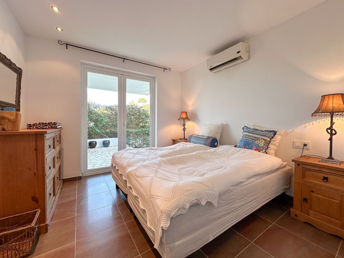 The ground floor features an open kitchen and living area, where light and space take center stage. Here you'll also find two bedrooms, each with their own en-suite bathroom – ideal for family or guests. This floor has direct access to a covered terrace with glass curtains, which can be opened to let the fresh breeze flow in. From here, there is further access to a large private terrace with a beautiful pool, surrounded by vegetation, making the ground floor perfect for outdoor living.
