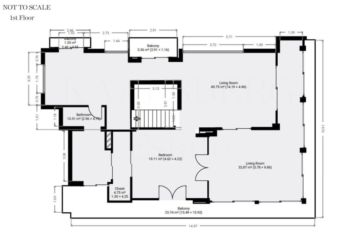 The first floor contains a spacious living room, a bedroom with a walk-in closet, and a luxurious en-suite bathroom. The walk in closet functions as a "hidden door" to the bathroom.