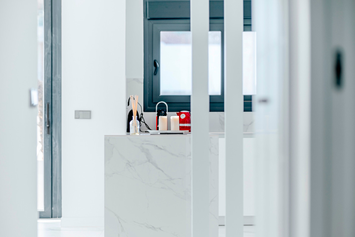 The spacious living area is bathed in natural light, featuring an open-concept kitchen equipped with high-end Samsung smart appliances and exclusive Porcelanosa finishes. With its seamless design and premium materials, this space is perfect for both everyday living and entertaining.
