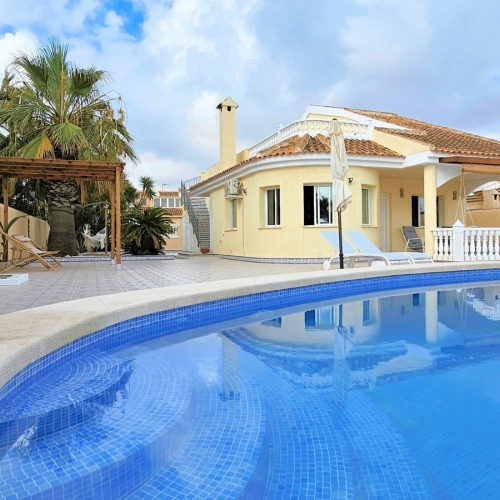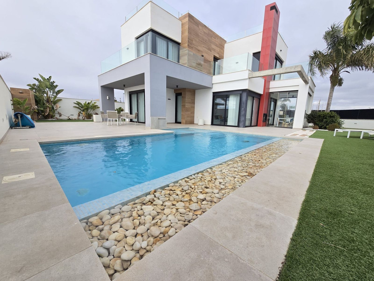 We are delighted to present this exquisite detached villa with 180 degrees of clear open views of the Mar Menor and La Manga in Los Alcazares. Constructed in 2018 with the finest materials, this stunning property offers a captivating allure and boasts a private 500sqm plot spanning two levels.