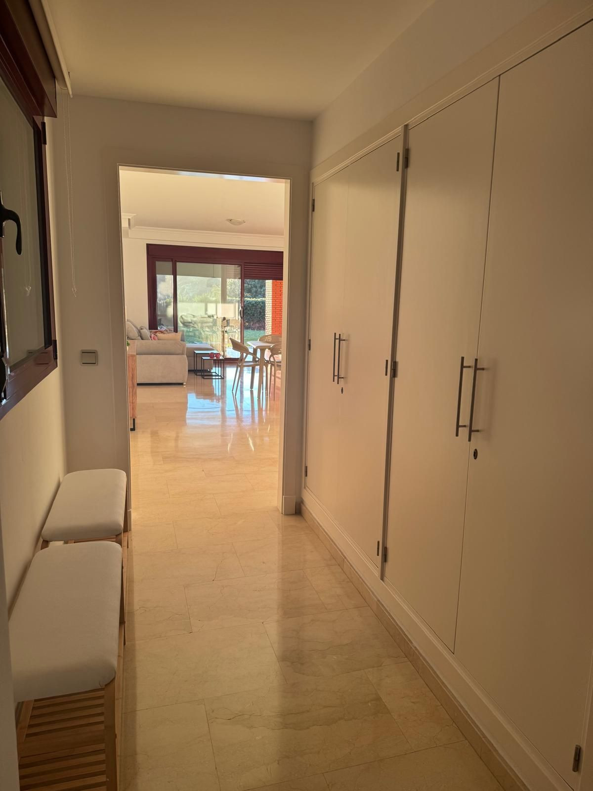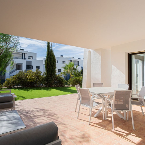 Discover this spectacular ground floor apartment with a huge 165 m² private garden, ideal for enjoying the sun and tranquility. With 2 bedrooms and 2 bathrooms, this apartment offers a spacious living room that connects directly to a west-facing terrace, perfect for relaxing while admiring the partial sea views. The development, valued for its quality construction and Mediterranean design, features three communal garden areas, two large swimming pools (one saltwater), a children's pool, a paddle tennis court, a gym, and a spa.