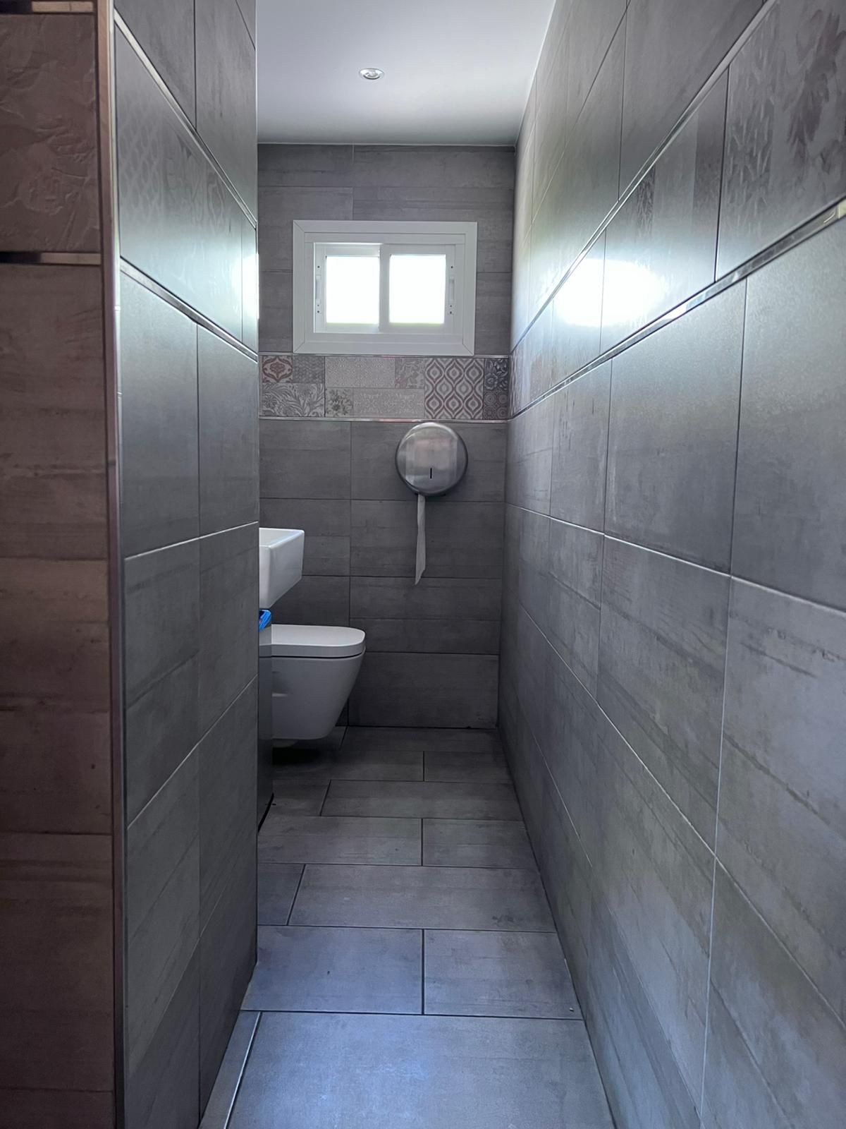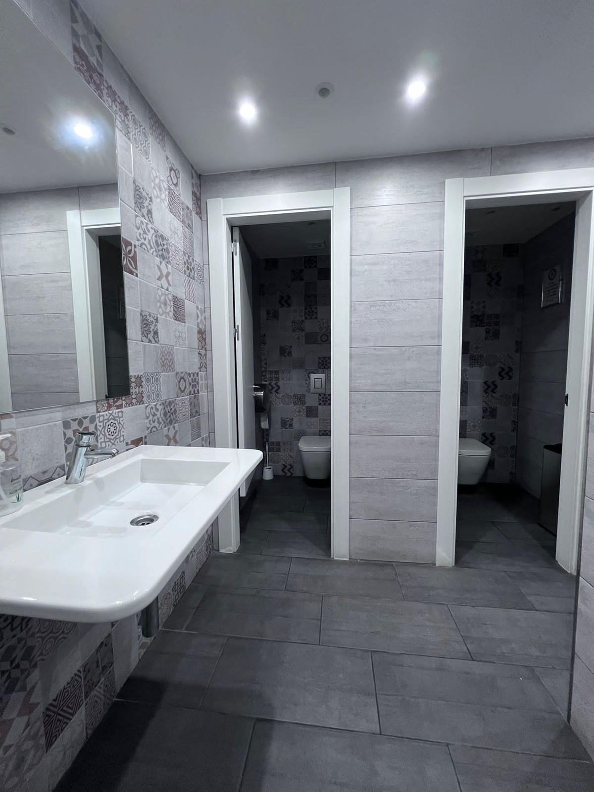 Ascending the staircase, you enter the heart of the estate, the restaurant area. A fully equipped, professional-grade kitchen awaits, complete with high-quality appliances and everything needed to serve large gatherings. From here, you step into the expansive dining hall, a space designed for entertaining, featuring a fully fitted bar, stylish bar tables, and guest bathrooms.
