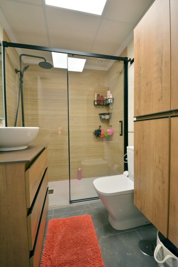 The property spans 90 square meters across three thoughtfully designed levels. The ground floor features a bright living room, a guest toilet, and a separate kitchen that opens to a spacious back patio with a laundry area and barbecue, perfect for outdoor entertaining. At the front of the house, a semi-covered porch with a bioclimatic awning provides a serene spot to enjoy sea views.