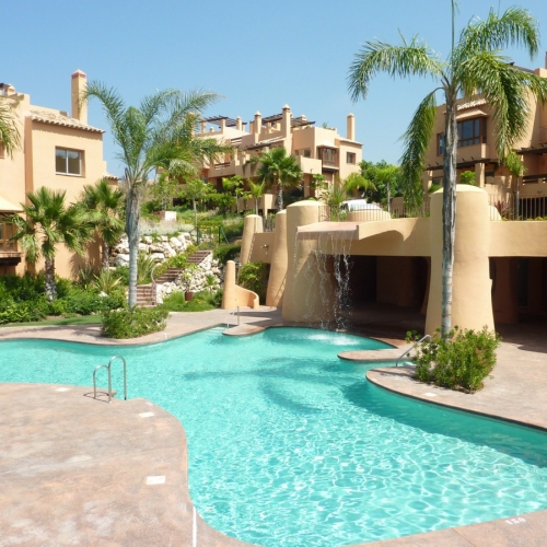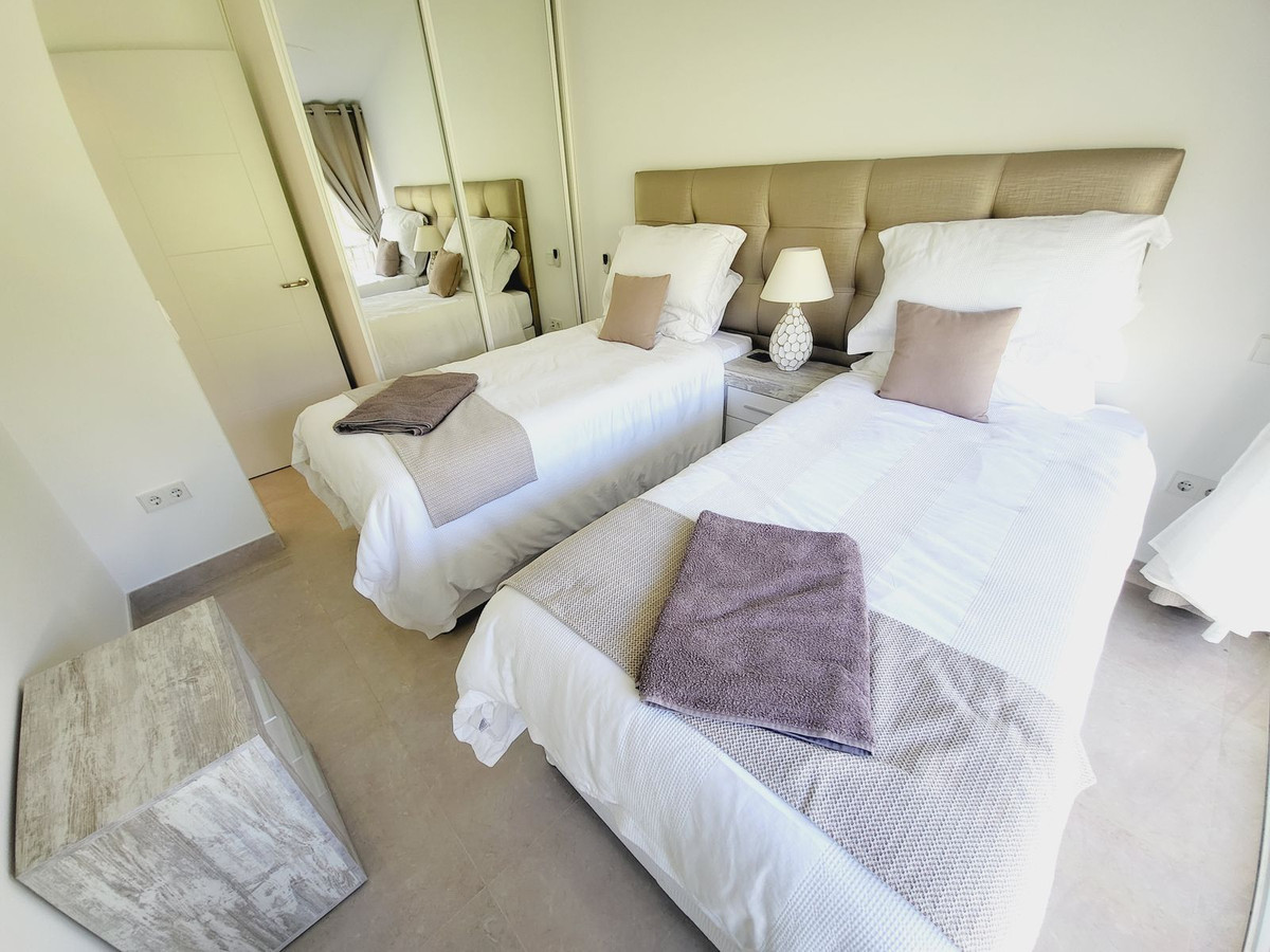 BRIEFLY COMPRISES: PRIVATE ENTRANCE TO A REAR DINING TERRACE/PATIO WITH IN-BUILT STORAGE, ACCESS FROM THIS TERRACE TO THE KITCHEN AND MAIN ENTRANCE, OPEN PLAN KITCHEN LEADING TO A DINING AREA WHICH FLOWS THROUGH TO THE GENEROUS LOUNGE AREA. FROM THE LOUNGE YOU HAVE ACCESS TO A LARGE SUNNY TERRACE WITH GLASS CURTAINS THAT OPEN OUT ON THE GARDENS BEYOND. FROM THE LOUNGE AREA AN INTERNAL DOOR OPENS TO A GUEST CLOAKROOM AS WELL AS GIVING ACCESS TO THE STAIRS TO THE BEDROOM LEVEL. THE CENTRAL FEATURE STAIRCASE GIVES ACCESS TO TWO GENEROUS DOUBLE BEDROOMS AND A MODERN GUEST SHOWER ROOM WITH THE LANDING ALSO LEADING TO THE HUGE MASTER SUITE WITH IT´S OWN COMPLETE BATHROOM WITH SEPARTE SHOWER AND BATH, AS WELL AS A GOOD SIZED WALK-IN DRESSING ROOM. A SMALL TERRACE OFF THE MASTER BEDROOM HAS VIEWS OVERLOOKING THE STUNNING COMMUNAL POOL AND GARDENS AS WELL AS SOME SEA VIEWS ACROSS THE BEAUTIFUL PINES IN LOWER MIRAFLORES.
