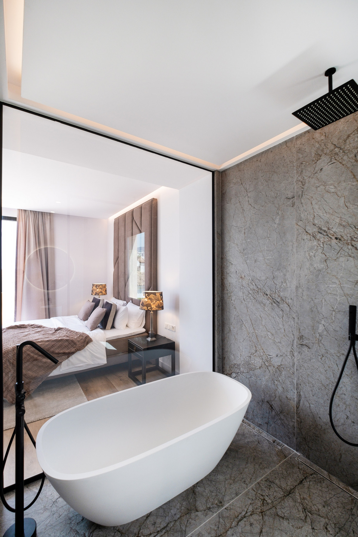 This property's outdoor spaces are as inviting as its interiors. The covered terrace leads to a landscaped garden and features an infinity pool that enhances the panoramic sea views. Integrated sunbeds provide an ideal spot for soaking up the Mediterranean sun, while a sundeck, pergola, BBQ area, and chill-out spaces create a perfect atmosphere for social gatherings or peaceful relaxation. As the day winds down, the sunset terrace offers an ideal setting for movie nights under the stars with its unique moonlight cinema.