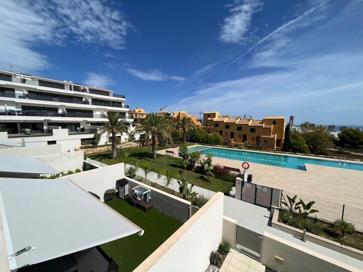 Great, semi- new apartment in Sierra Cortina with sea views!One of the finest properties on the Costa Blanca!This apartment offers 77 square meters of usable space, thoughtfully designed for comfort and convenience. Interior layout:- A spacious living room with a fully equipped, American-style kitchen and direct access to a large terrace, which also connects to the master bedroom.- The master bedroom is a generous double room with a built-in wardrobe and en-suite bathroom featuring a shower.- A second bedroom with a built-in wardrobe and large window provides ample natural light.- An additional full bathroom is available for added convenience.Features of the urbanization:- Large communal areas with two swimming pools: a large one and a children's pool with a waterfall.- Fully equipped gym.- Sauna and jacuzzi for communal use.- Barbecue area and children's playground.- Private parking and storeroom.Location:Ideally located near all essential services, the apartment is just a 10-minute walk from a major shopping center and public transport stops (bus and tram). It's 30 minutes from Alicante International Airport and close to popular attractions like Terra Mítica and Aqualandia. Plus, the beautiful beaches of Benidorm are only 3 km away.This property combines modern living with top-notch amenities, making it perfect for both holiday stays and long-term residence.