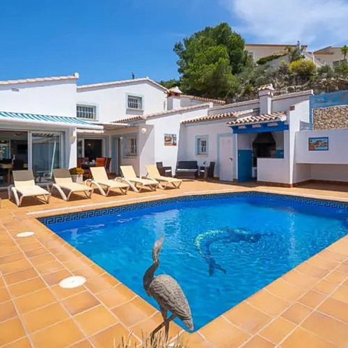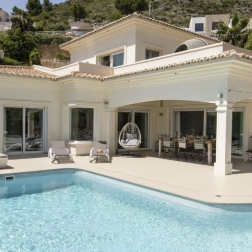 This beautiful classic-looking villa has 4 bedrooms and is located in Pinar de l'Advocat in Moraira. Built in 2001 and recently renovated in 2023, this well-maintained property offers all modern conveniences and is spread over two floors. Situated in a quiet residential area less than 10 minutes' drive from the lively center of Moraira and the beach, the property has beautiful views over the valley towards the sea.