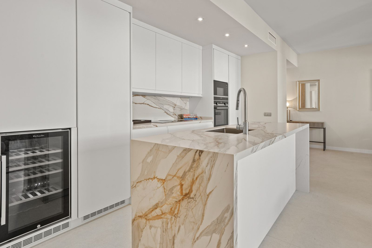 The perfect property for relaxed Marbella living! This penthouse was just fully renovated to a very high standard and is located in the popular Aloha area of Nueva Andalucia, with top restaurants, cafes and sports clubs all within easy walking distance. Set all on one level, it features spacious living space throughout with a beautiful open-plan modern kitchen, fully equipped with Siemens appliances, a luxurious living and dining area, 3 bedrooms, 3 bathrooms and a huge terrace surrounding the entire apartment. The master bedroom features a custom-built walk-in closet and a very spacious en-suit bathroom with a double stone sink and large walk-in shower.