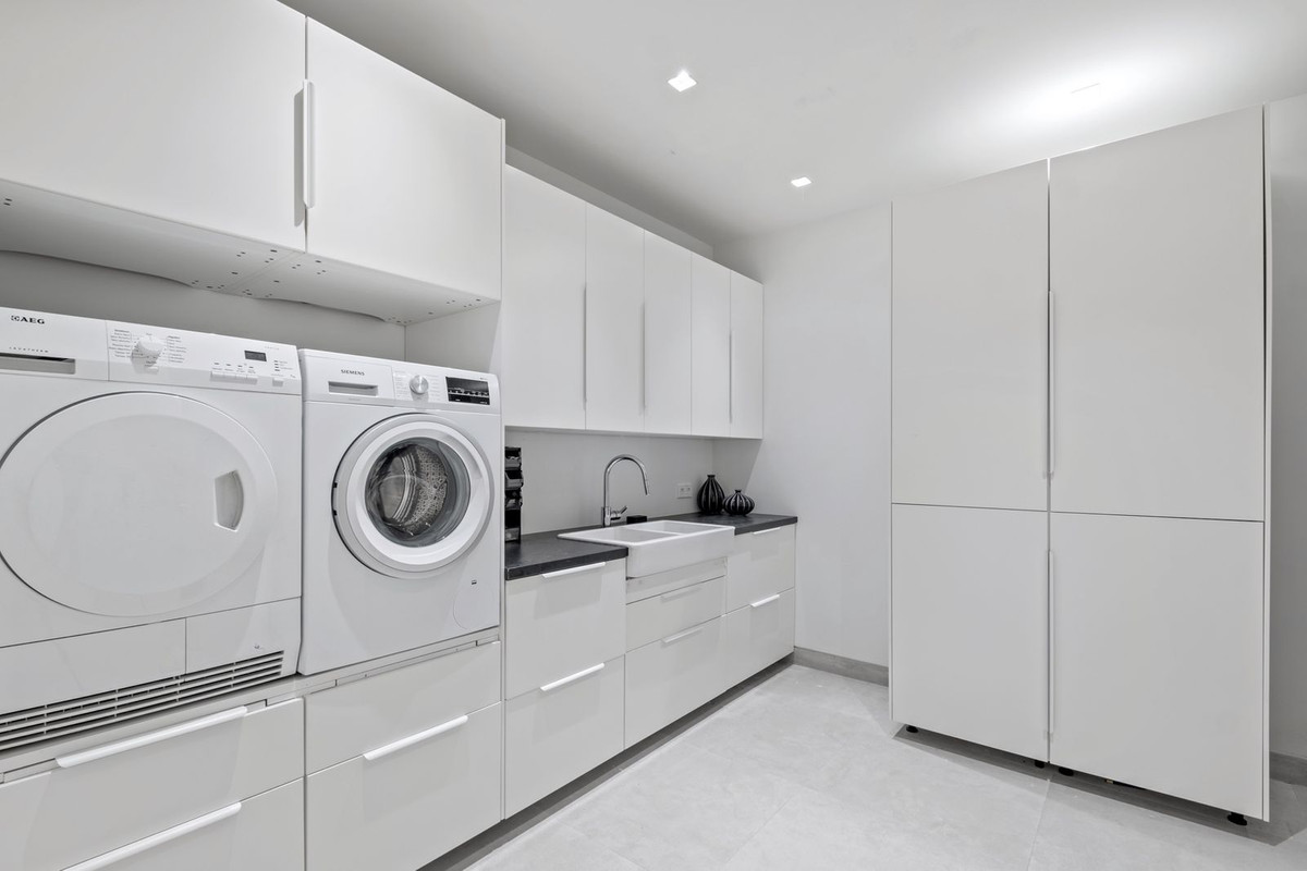 The heart of the home is its open-concept kitchen, equipped with Siemens appliances, a hidden pantry, and a Liebherr fridge, all seamlessly integrated for an impeccable culinary experience.