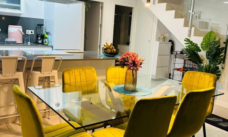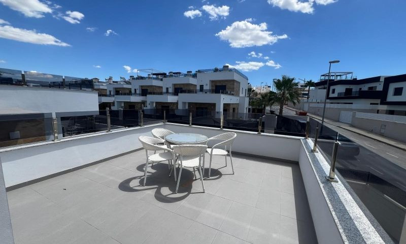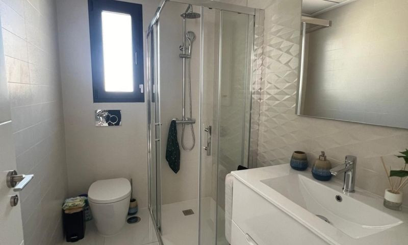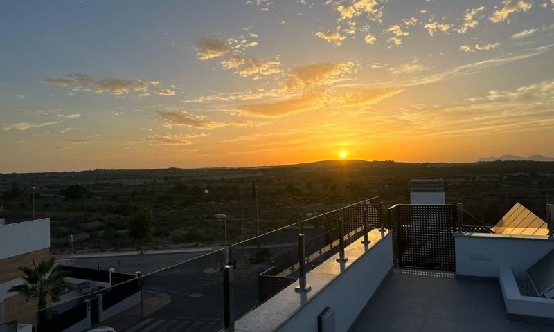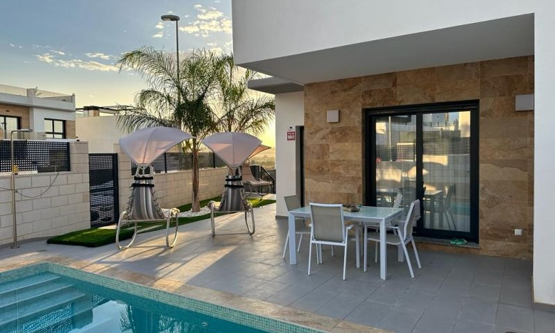 The house was built in 2023. It has 2 floors. Ground Floor with Plot, Pool and rear with driveway. Spacious living room with large facing window and direct access to the pool. Modern design kitchen and direct access to the side of the plot. Equipped with all types of modern facilities. Full bathroom and double bedroom. The First Floor has a full bathroom and 2 double bedrooms, one of them with a large sunny terrace. On the upper floor there is a large solarium with an awning and Mediterranean views of the rural areas and mountains of Crevillente and Orihuela.