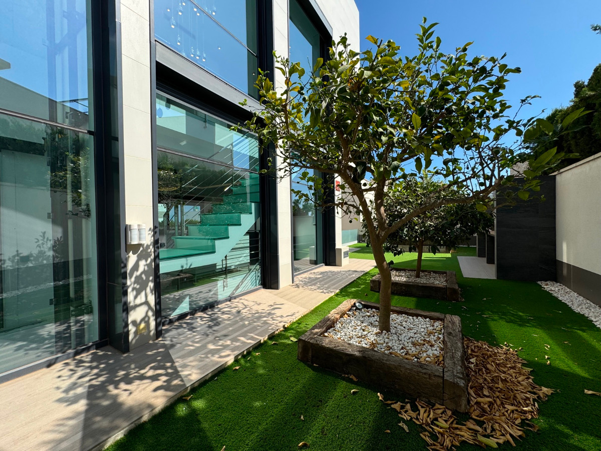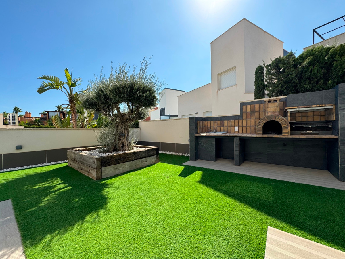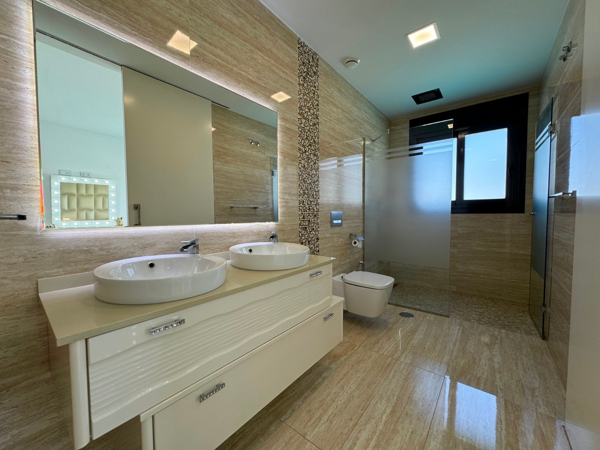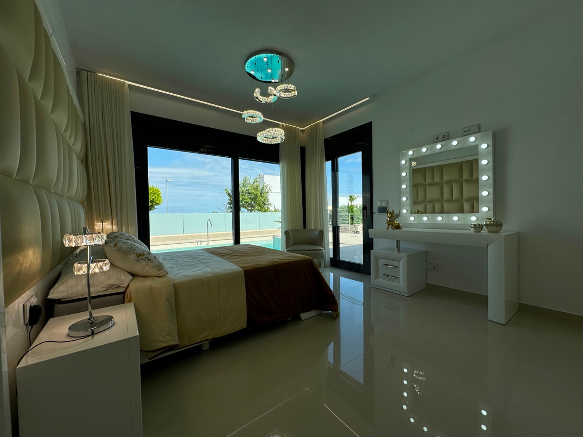 This newly built luxury villa contains 5 spacious bedrooms and 4 modern bathrooms, carefully arranged over two floors and a basement, all seamlessly connected by a practical lift and an elegant glass staircase with soft interior lighting. The basement is dedicated to entertaining and includes a game room (with pool table and football table), party room with full kitchen, two additional bedrooms, two storage rooms and a full bathroom. The ground floor consists of an open-plan living and dining room with a central kitchen with an island, a master bedroom with en-suite bathroom, as well as a utility room and guest toilet. On the first floor you will find two large bedrooms, two further bathrooms and access to private balconies. The top floor opens to a spectacular 70 m² solarium with breathtaking panoramic views.Premium Features and Interface The villa is fully equipped with air conditioning, central heating and underfloor heating and is sold fully furnished with design work, excluding personal items. Luxurious amenities include motorized sofas, brand new mattresses, a pyrolysis steam oven, a combined refrigerator/ice maker, solar panels and a pellet stove for eco-friendly heating. Security is paramount, with reinforced windows and doors, security keys and a sensor-based alarm system.Outdoor Paradise Step into the carefully landscaped garden with a private pool with waterfall, jacuzzi and hydromassage jets. Around the pool there is a lush green area, an outdoor shower and a large parking lot for several cars.Location – Bellavista Residence Residencial Bellavista is located in the quiet and picturesque neighborhood of San Miguel de Salinas and offers some of the most beautiful views of the Costa Blanca. Located just 7 km from the beautiful beaches of Orihuela, close to the best golf courses and a large shopping center with all the necessary services, restaurants and shops, this property is ideal for those who value both nature and tranquility.