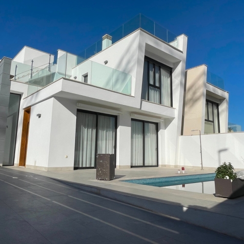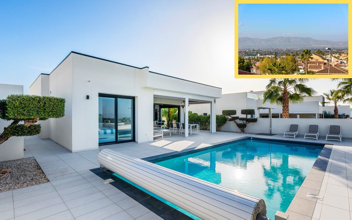 This impressive property, designed and built by a renowned Belgian project developer, is constructed with high-quality materials and exceptional craftsmanship. The villa has 4 spacious bedrooms and 2 family bathrooms, one of which has a bathtub. Upon entering, you're greeted by a spacious living room with high ceilings and an abundance of natural light streaming through large sliding windows. These windows can be fully opened, seamlessly merging indoor and outdoor spaces, allowing you to fully enjoy the beautifully landscaped garden, mountain views, and private pool. The open-plan kitchen, carefully integrated into the living room, creates a functional and stylish connection between the indoor and outdoor spaces. From the living room, you have direct access to the terraces and garden, which offer versatile areas for relaxation and complete privacy. Main features of the villa: Fully equipped kitchen. Separate utility room and storage room. Air conditioning (heating and cooling). Outdoor storage space, ideal for bicycles or other items. Private pool with heat pump for year-round enjoyment. Automatic pool cover with 6x heating effect. Parking space for two cars. Electric access gate. Location: Situated on the edge of a charming Spanish village, the property is just 1 km from all essential amenities. The Mediterranean beach of Guardamar del Segura is just a 13-minute drive away, and there is a golf course nearby. Alicante Airport is easily accessible via the AP-7 or N-332. This villa is perfect for those who value peace and comfort while staying close to a vibrant neighborhood. Don't hesitate to contact us to experience this remarkable property for yourself.
