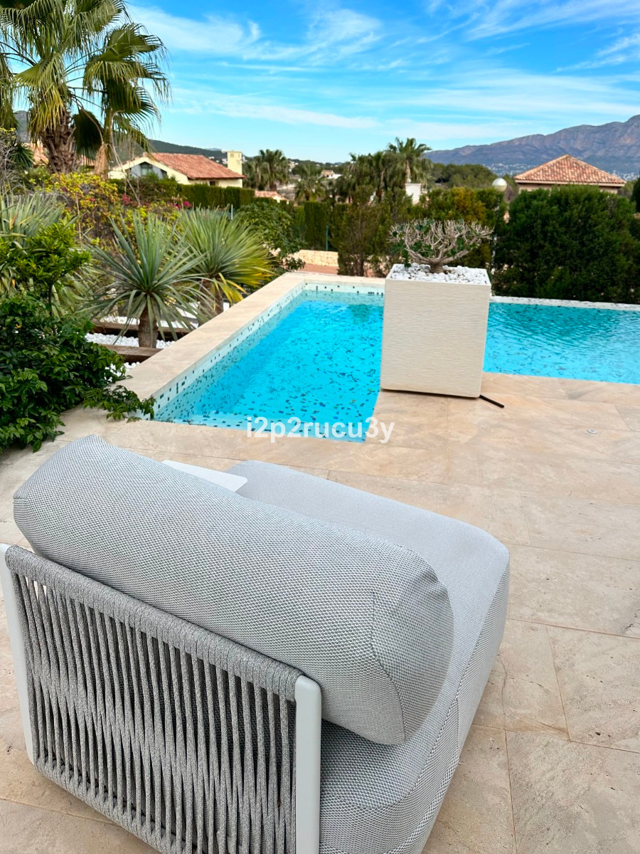 The villa features **five en-suite bedrooms**, each meticulously designed to offer privacy and refined luxury. The open-plan living area showcases **breathtaking panoramic views** of the **Mediterranean Sea** and the **Montgó mountain**, creating a seamless connection between indoor and outdoor living.
