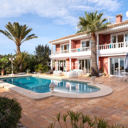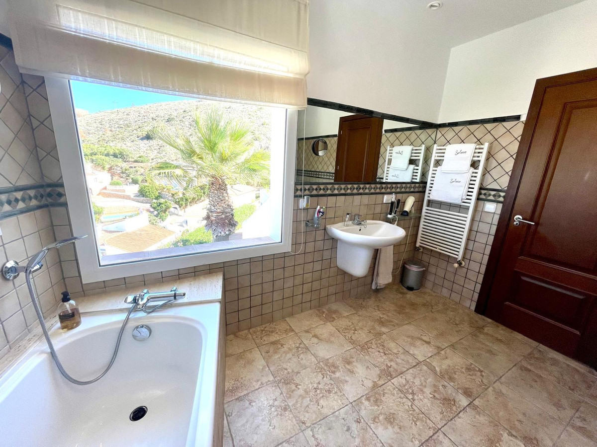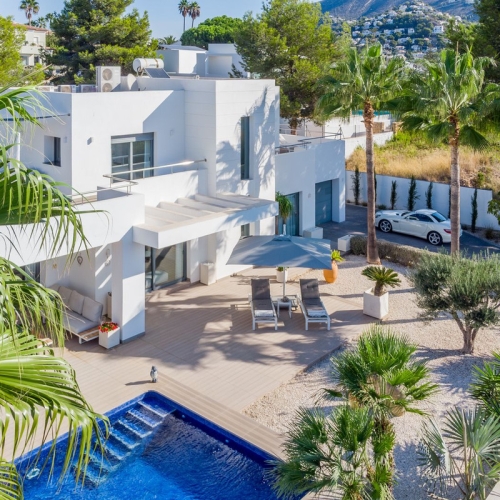 Villa Solace "The Bond Villa" This delightful Ibizan-styled villa is owned by two world-acclaimed film and theatre producers, which gives a clue as to where the name of this villa came from. Pearches on the hillside above the neighbouring villas look over the Valley of El Portet; this villa could be a setting out of a James Bond film, with dramatic panoramic open views of the Benrnia Mountains and the turquoise blue sea.