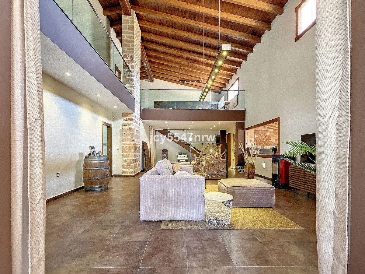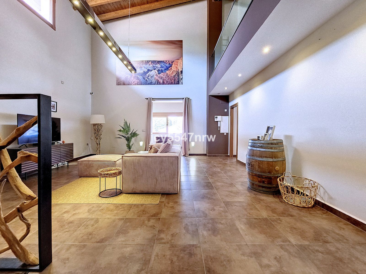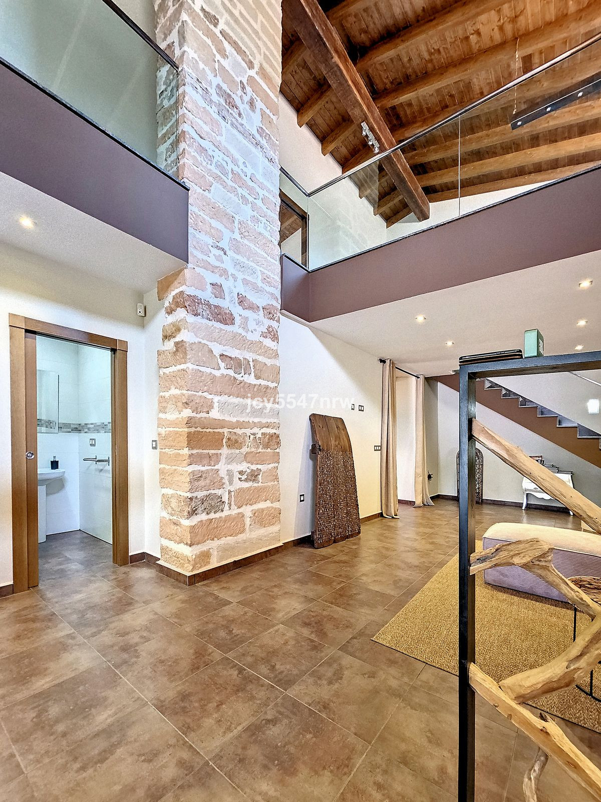 It was once an old bodega (winery) and has been fully renovated to an exceptionally high standard. On the ground floor, the property features a spacious entrance hall and a stunning large open-plan living/dining room with vaulted beam ceilings. The high-quality kitchen/breakfast room is fully equipped with granite worktops, a freestanding wood-fired Aga, and a separate utility room with wine storage. The heating and hot water system are located in the boiler room. Also on the ground floor is a large double bedroom with an en-suite bathroom and built-in wardrobes, French doors leading to the garden, and a large wardrobe closet.