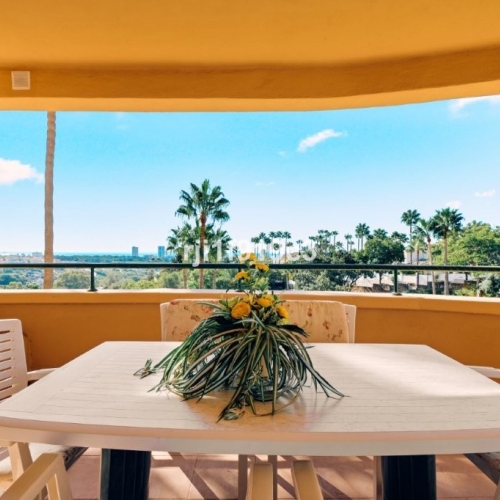 Las Terrazas de Santa Maria Golf is located in Elviria, Marbella East, direct on the Golf Course and 2 km from the beach. This apartment features several communal pools, manicured gardens, underground parking & a Lift.