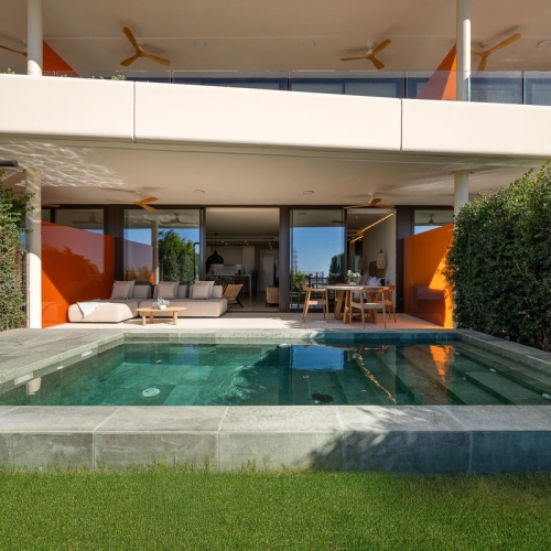 The open-plan living area connects the kitchen, dining, and lounge into one social space, with large windows that blur the line between indoors and outdoors. The generous 74 m² terrace extends the living room, creating a bright and airy feel. The kitchen is fully equipped with top-of-the-line NEFF appliances, a wine cooler, and a freezer with an ice maker and filtered water.