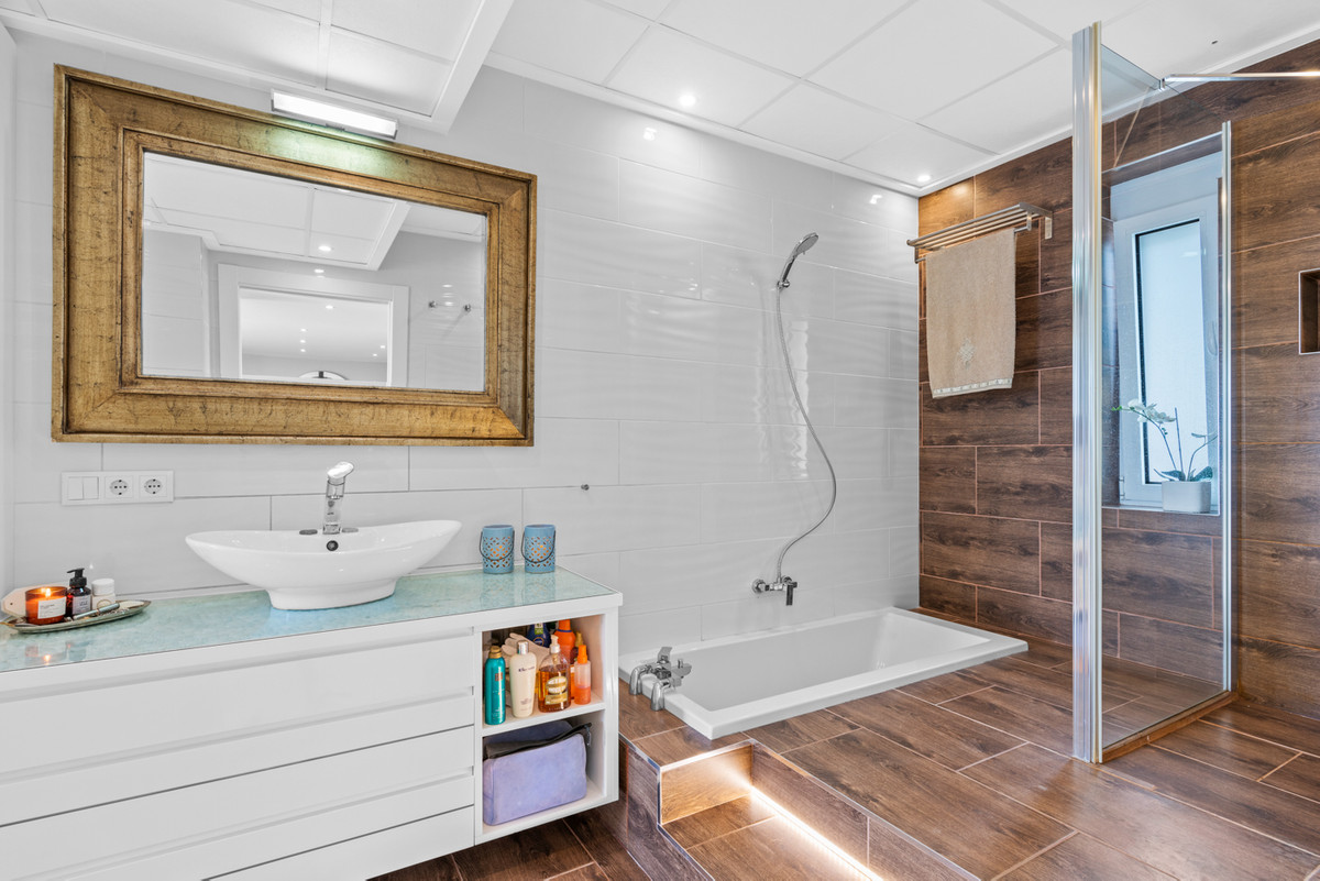 The villa has a main living area of 150 m2 divided between two floors. In addition it has a basement of 100 m2. In the main floor you can find an entrance area, the master bedroom with a bathroom and a walk-in-closet, and an open-plan kitchen, dining and living room. From the bedroom you have direct access to the garden, and from the living room you have direct access to a glazed terrace. The first floor consists of two double bedrooms with fitted wardrobes and a shared bathroom. From the hallway you can access a large terrace with a jacuzzi, and from one of the bedrooms you can access an additional private terrace overlooking a park. The basement has a separate access and consists of an entrance area, a living room, a double bedroom, an office, a bathroom and a large storage / utility room.