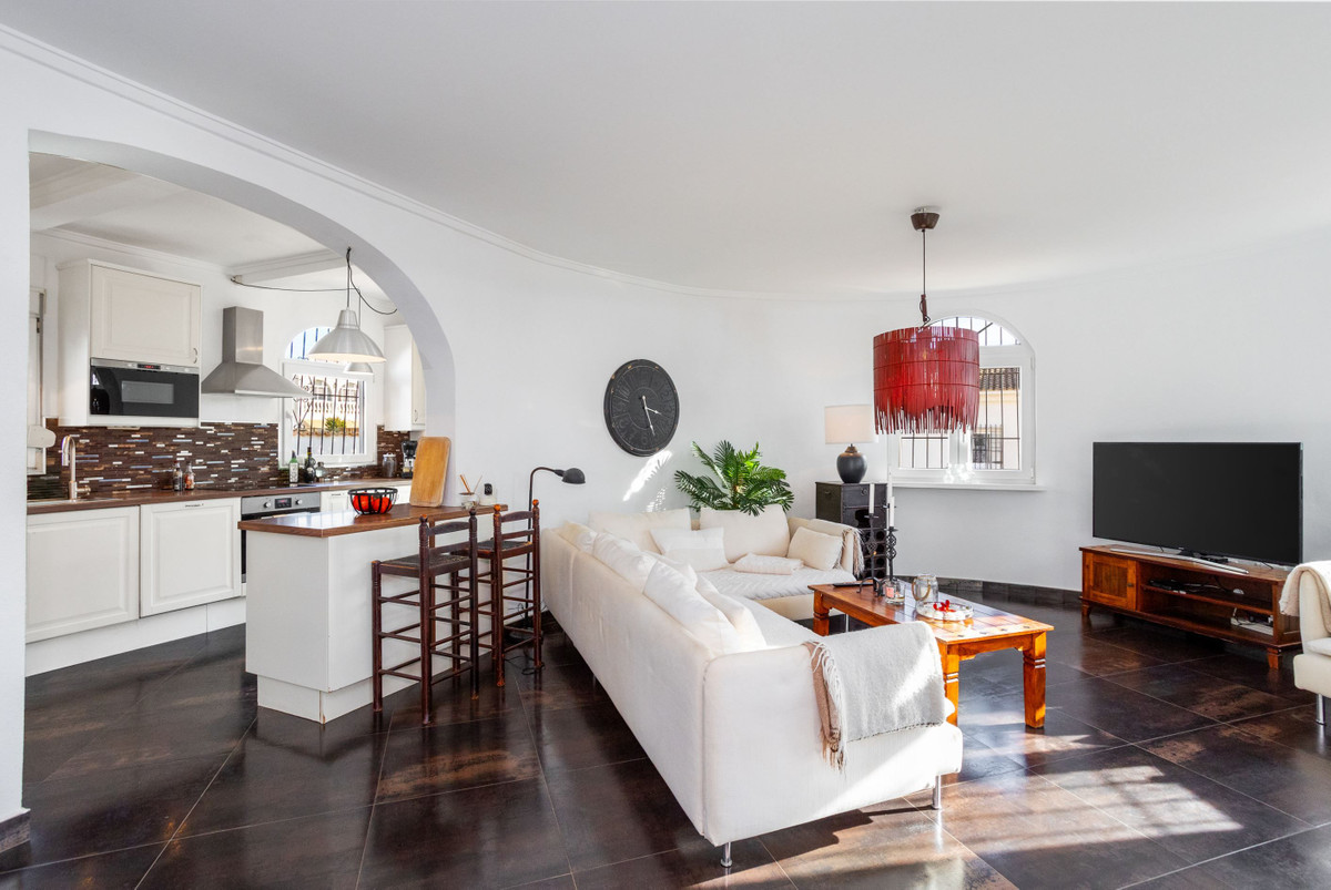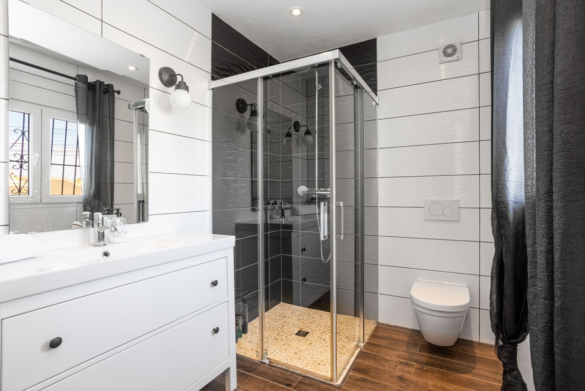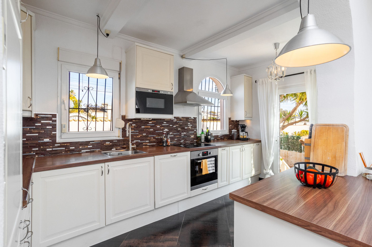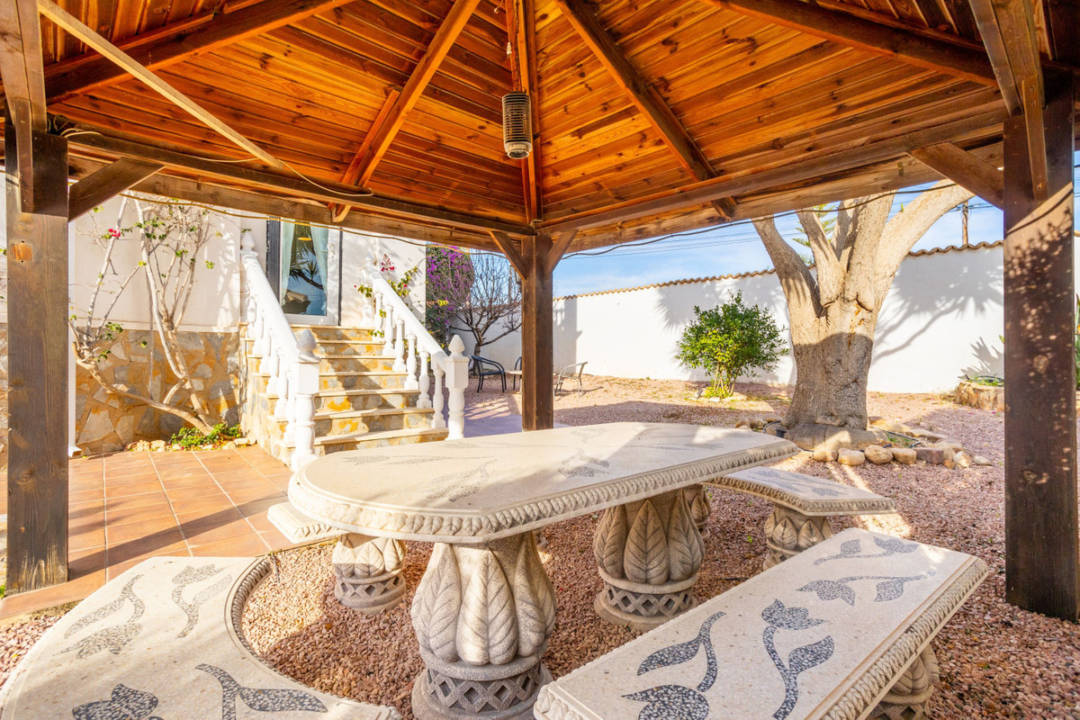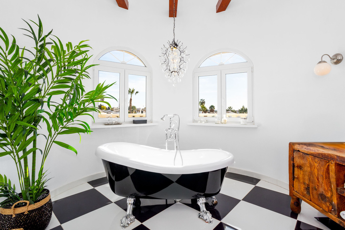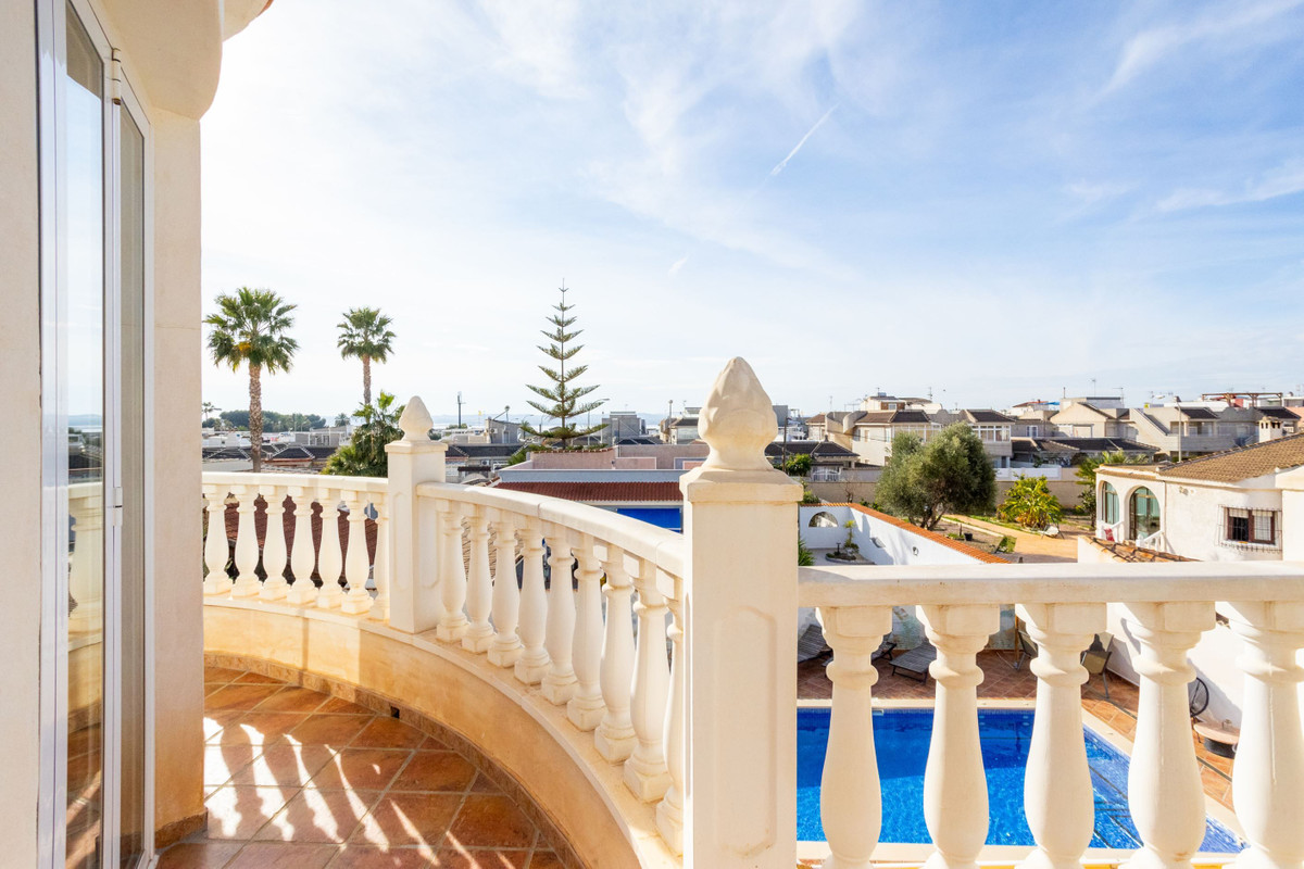 Elegant villa with fantastic light flow and private pool A warm welcome to this elegant villa with a nice location in El Chaparral. The villa, which consists of five bedrooms, four bathrooms, living room and kitchen, was renovated in 2015 and is in very good condition. On the large plot there is a private pool (heated) and plenty of space for outdoor furniture and sun loungers.