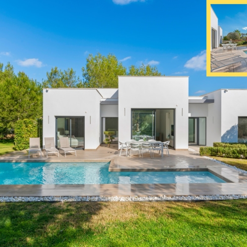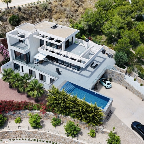 This stunning and spacious 4 bedroom detached villa is on a fantastic large, private plot in Las Colinas Golf Resort and Country Club, the most exclusive and prestigious golf resort in Costa Blanca with excellent facilities, including a driving range, 24 hour security, a spa, a beautiful club house and golf shop, a convenience store, and a choice of restaurants on the resort itself. This immaculate modern villa is cleverly divided into 4 areas connected by a hallway with huge windows, which offers privacy to each of the 4 bedrooms. In one area you will find an open plan, sleek kitchen and dining area, storage and washing room as well as a separate toilet for guests. The living room offers gorgeous views towards the terrace, large well maintained garden and swimming pool, with direct access from the living room. On the ground floor you will find 3 double bedrooms, each with their own private en-suite bathroom. On the first floor you have the benefit of privacy from guests with the impressive master bedroom with en-suite bathroom. This property has to been seen to be fully appreciated, and is light and bright with the huge windows taking advantage of the fabulous views. For your comfort and enjoyment all year round, this highly desirable villa comes with fully integrated hot and cold air conditioning throughout, as well as the great benefit of the swimming pool being heated! It is located within a 15 minute drive of a range of other perfectly maintained golf courses such as Campoamor, Villamartin and Las Ramblas and nearby blue flag beaches, at Cabo Roig, La Zenia and Playa Flamenca to name a few, and the American-style open air shopping mall Zenia Boulevard, which is open from 10am - 10pm all year round.