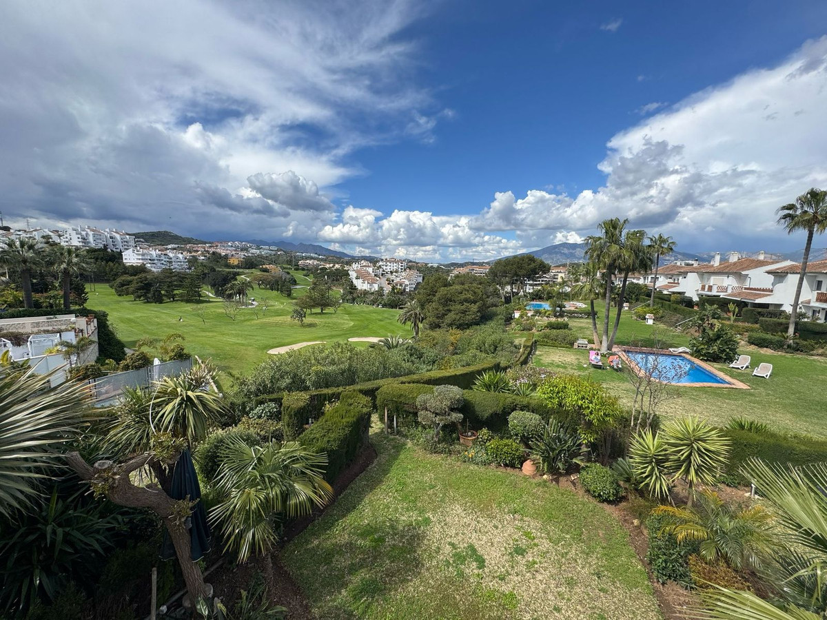 The community boasts beautifully maintained gardens, two communal swimming pools—including a heated one—ensuring year-round enjoyment. Inside, the property features a bright, open-plan living and dining area with a cozy built-in fireplace, leading to a spacious terrace with stunning views of the mountains, golf course, and pool.