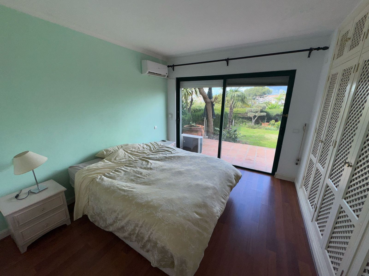 The lower level houses the master suite with direct access to a private garden, along with two guest bedrooms and a private double garage. Additional features include a fully fitted kitchen, guest toilet, hot and cold air conditioning, electric shutters, and fitted wardrobes. This property presents an excellent renovation opportunity in a peaceful yet well-connected residential community.