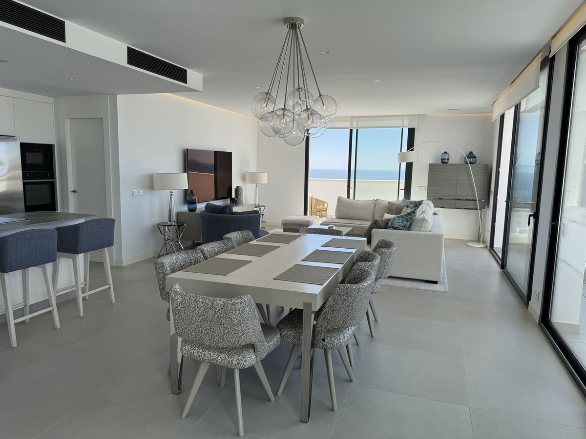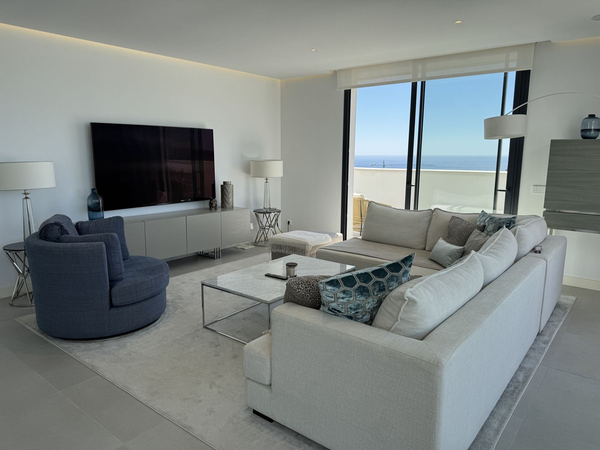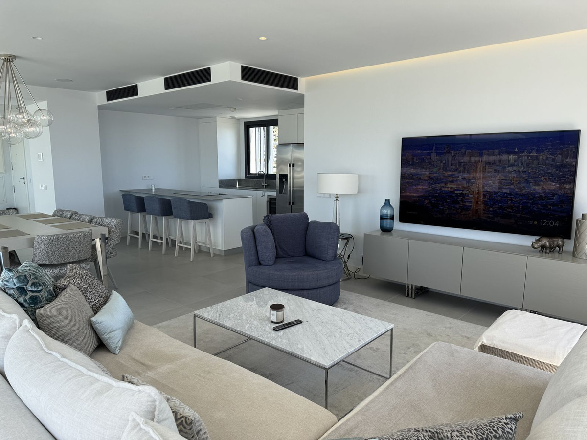 The living room enjoys incredible 180º views of the sea, the entire coast, and the mountains thanks to the large windows with security glass. These open onto the large terrace with a private pool, a dining table for 8 people, sun loungers, and a space designed for an outdoor kitchen/barbecue.