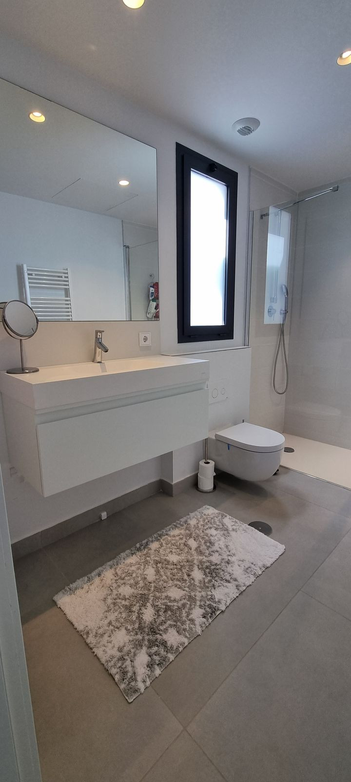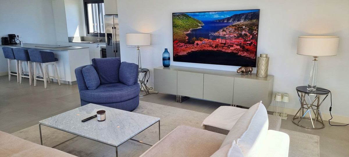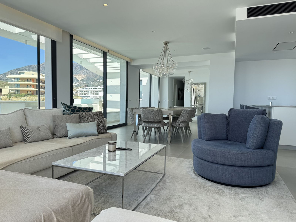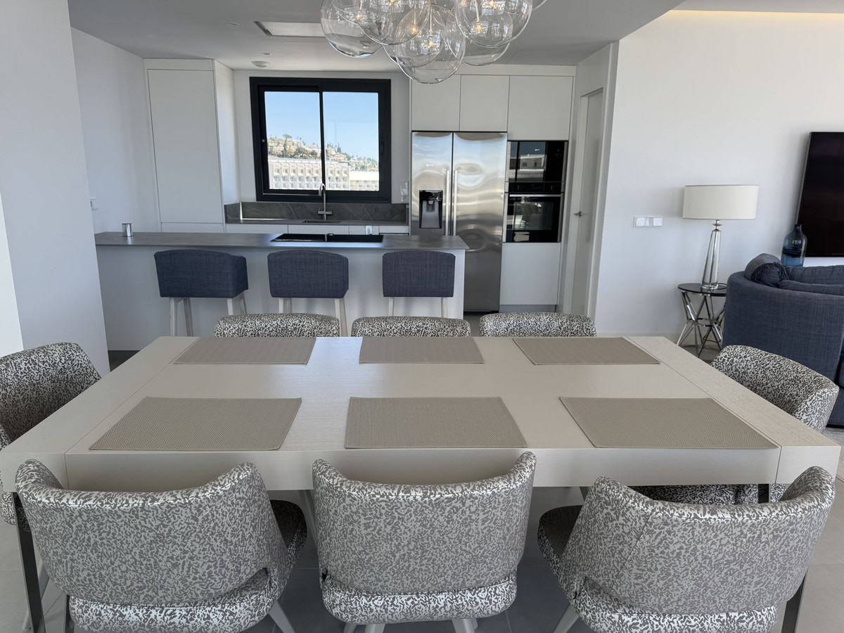 The living room enjoys incredible 180º views of the sea, the entire coast, and the mountains thanks to the large windows with security glass. These open onto the large terrace with a private pool, a dining table for 8 people, sun loungers, and a space designed for an outdoor kitchen/barbecue.