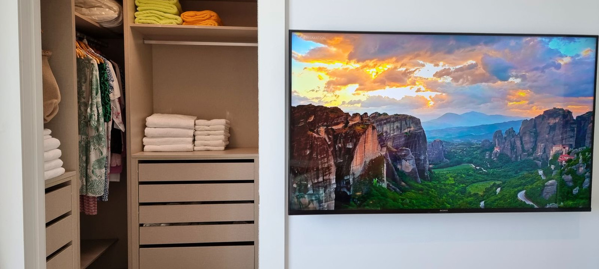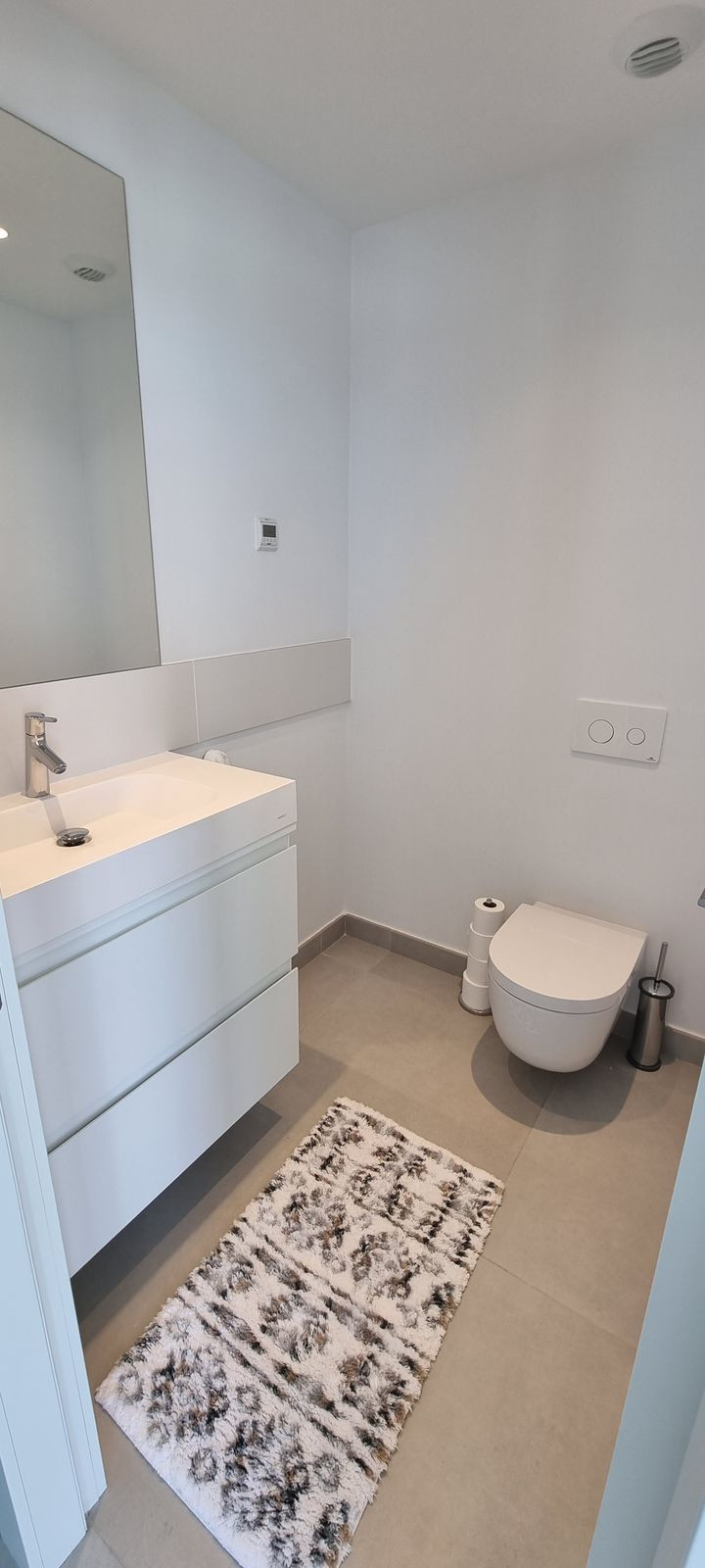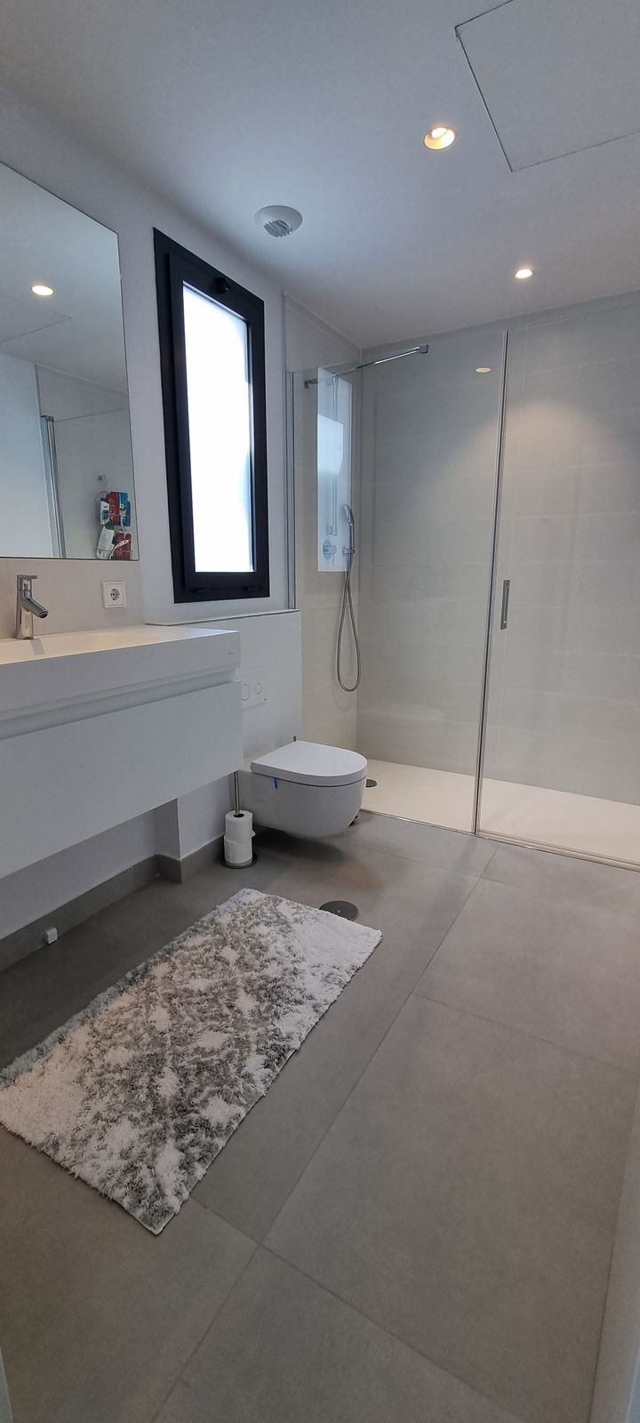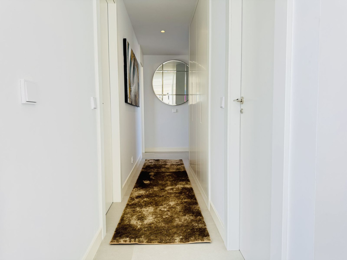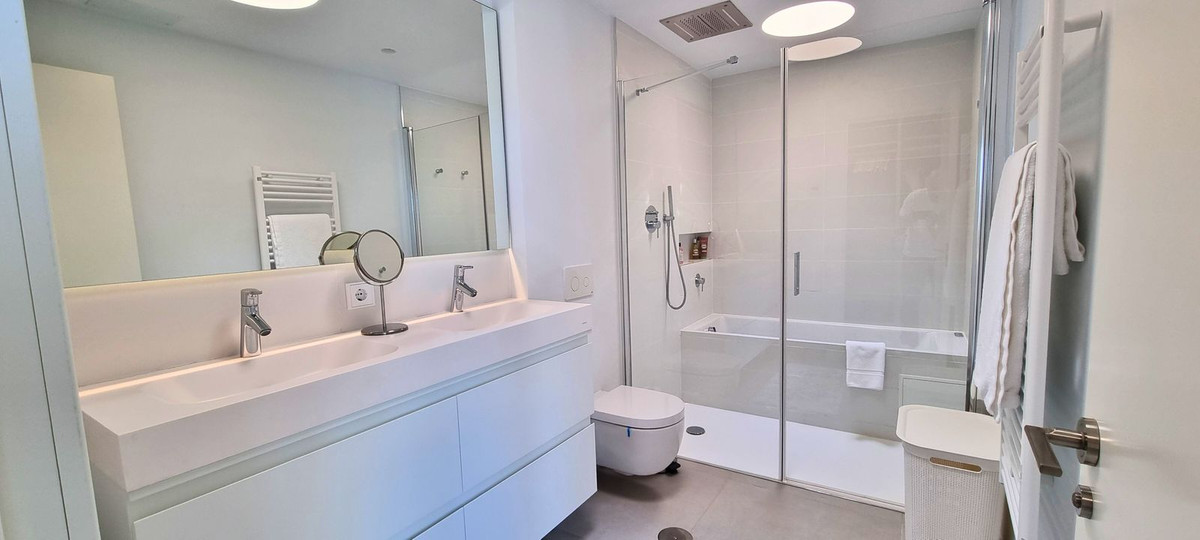 In the hallway leading to the sleeping area, we find a guest toilet, a full bathroom with a shower, two guest bedrooms with built-in wardrobes, and the master bedroom with a comfortable dressing room and a full ensuite bathroom with a bathtub and shower.