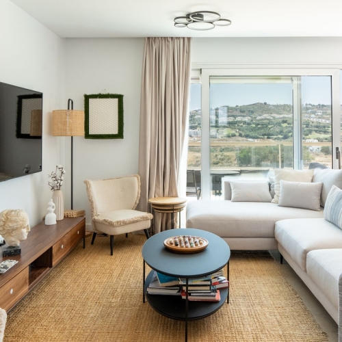This contemporary penthouse in Mijas, Málaga, offers a harmonious blend of comfort and style. It is located directly on a golf course and offers an impressive view of the sea, so you can enjoy both the tranquillity of the green and the panorama of the coast. The open-plan living area features floor-to-ceiling windows that flood the space with natural light and provide stunning panoramic views of the surrounding landscape. The living room is tastefully furnished with a plush white sectional sofa, accented by vibrant area rugs that add warmth to the polished floors. The sleek kitchen boasts modern navy cabinetry contrasted with white countertops and high-end stainless steel appliances, creating a sophisticated culinary space. The penthouse's three bathrooms are elegantly appointed, with one showcasing a floating double vanity in rich wood tones and a glass-enclosed shower. The primary bedroom is a serene retreat with direct access to a private terrace. It features a canopied bed, a spacious walk-in closet, and a luxurious en-suite bathroom with both a bathtub and a shower. The second bedroom offers equally impressive views and is furnished with a comfortable double bed. A dedicated office space provides a functional work area with a modern desk setup and ample natural light. The crowning feature of this property is the private terrace, complete with a swimming pool and expansive views of the surrounding hills and greenery. Additionally, the penthouse includes two parking spaces and two storage rooms. Residents also have access to excellent communal amenities, including a large swimming pool, a heated pool, and an outdoor kitchen that can be used by everyone. With its thoughtful layout, luxurious amenities, and prime location in Urbanización Cerrado del Águila, this penthouse offers a perfect balance of indoor comfort and outdoor living in the heart of Costa del Sol. We are pleased to be able to present this dream property to you soon, either personally or via virtual viewing. Because this world is unique - just like our Axarquía. In Andalusia. On the Costa del Sol. Here, on the sunny side of life...