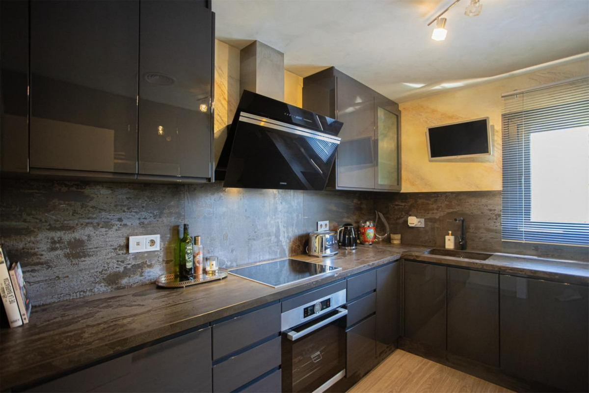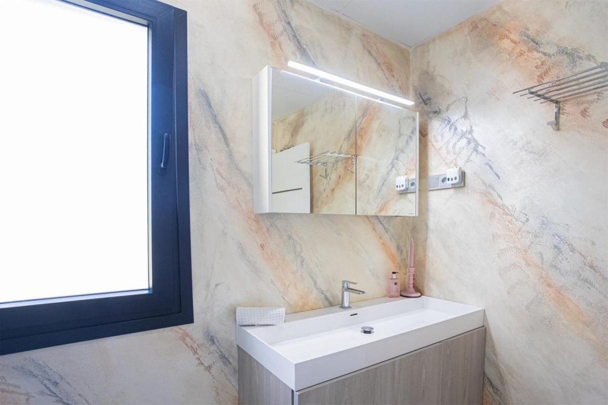 The home features 2 double bedrooms with built-in wardrobes, 2 full bathrooms, a fully equipped kitchen, a living-dining room with access to a large terrace, laminate flooring throughout, air conditioning, and 2 parking spaces included.