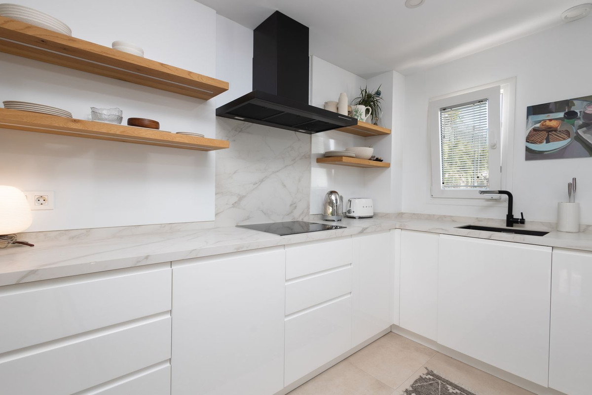 The main floor welcomes you with an elegant open-plan living and dining area bathed in natural light, offering direct access to the beautifully landscaped private garden that wraps around two sides of the home. This generous outdoor space is perfect for al fresco dining, entertaining guests, or simply enjoying the Mediterranean climate in total privacy.