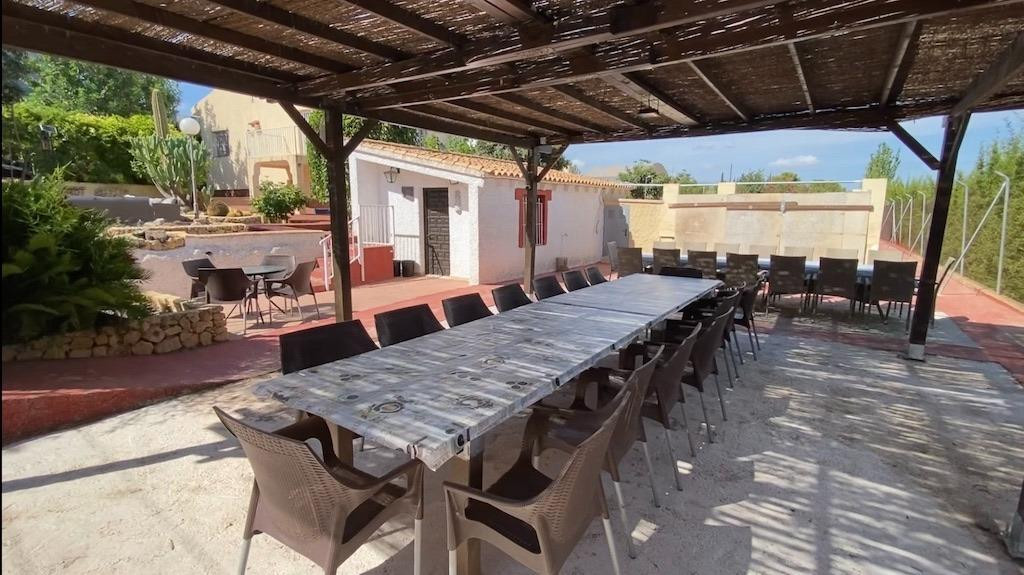 The plot has a large parking area for many cars and is divided into several zones. There are two outdoor dining and relaxation areas, a pétanque court, a swimming pool, a skatepark, a barbecue area, and a tennis court. The property offers many possibilities, and the owners are currently renting it out for short stays.