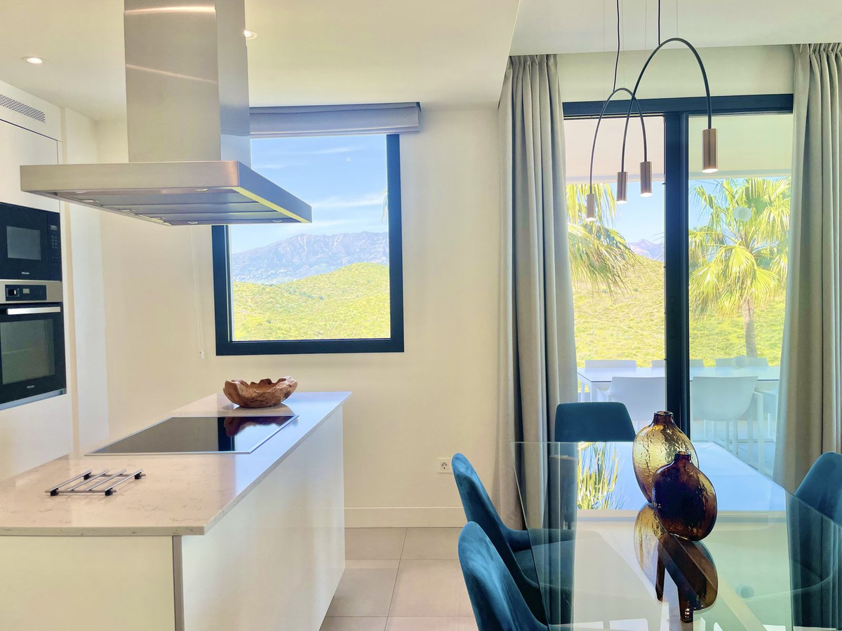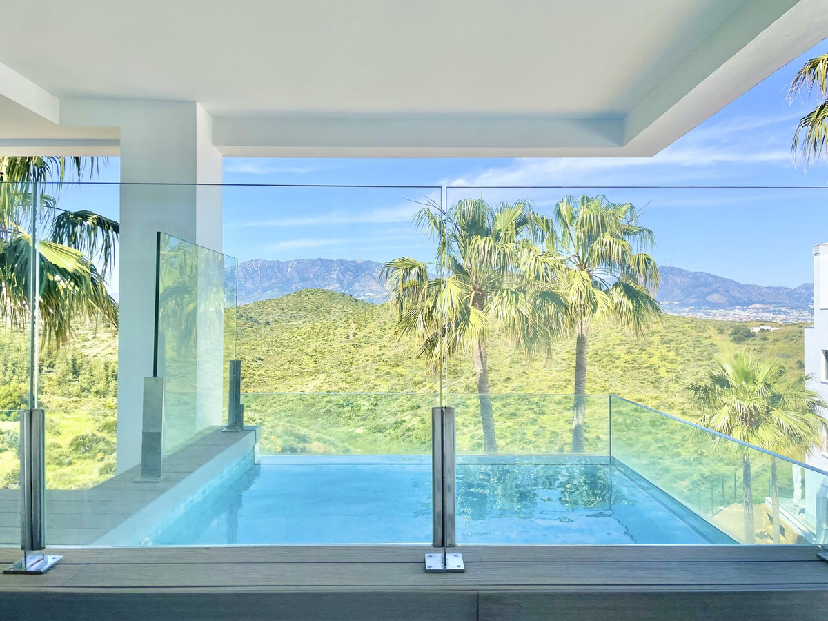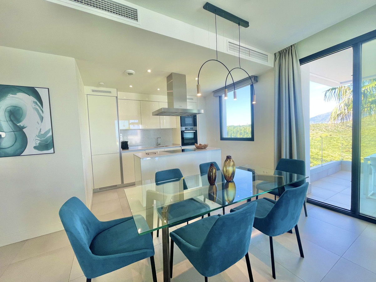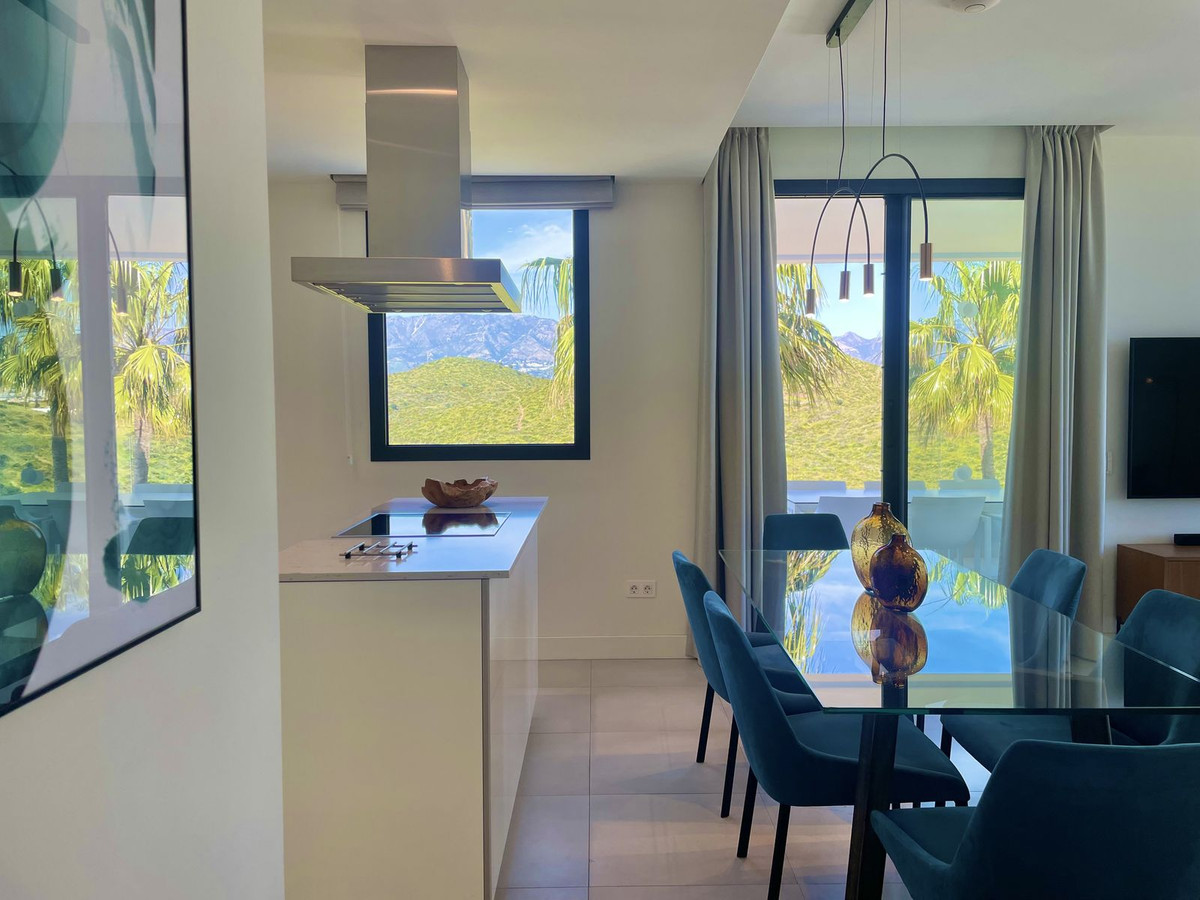 This apartment features two bedrooms and three bathrooms, with a modern, open-plan kitchen, dining, and living room. It also boasts a large private terrace with a plunge pool and sea views. The kitchen is equipped with all Miele appliances, air conditioning is integrated in all rooms, and the blinds are electric. The apartment is sold fully furnished, with underground parking and a storage room included.