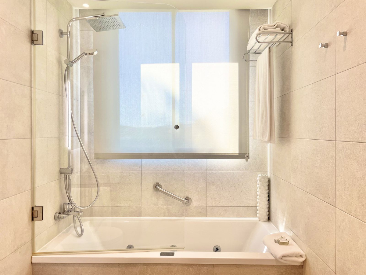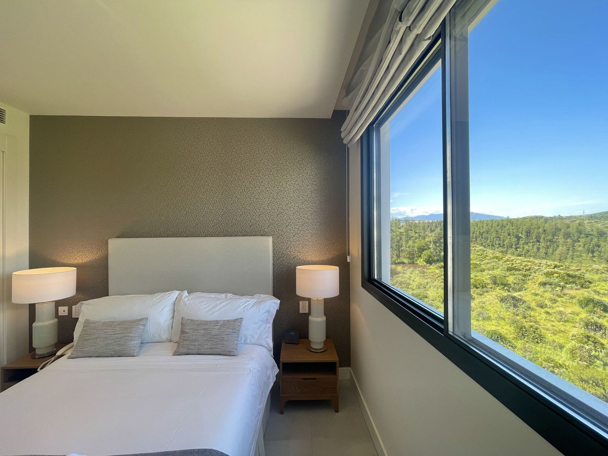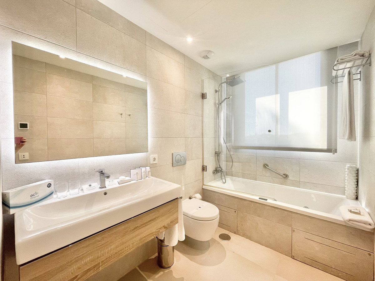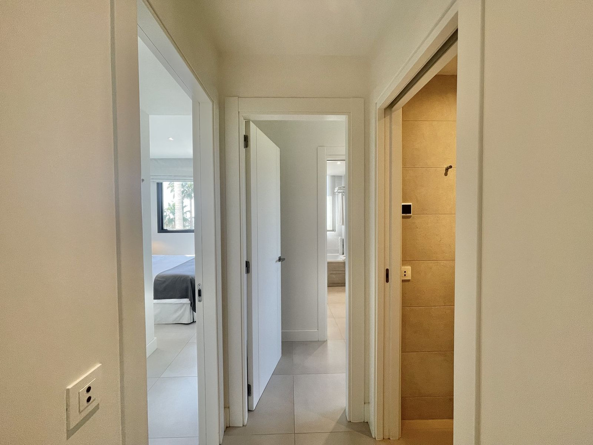 This apartment features two bedrooms and three bathrooms, with a modern, open-plan kitchen, dining, and living room. It also boasts a large private terrace with a plunge pool and sea views. The kitchen is equipped with all Miele appliances, air conditioning is integrated in all rooms, and the blinds are electric. The apartment is sold fully furnished, with underground parking and a storage room included.