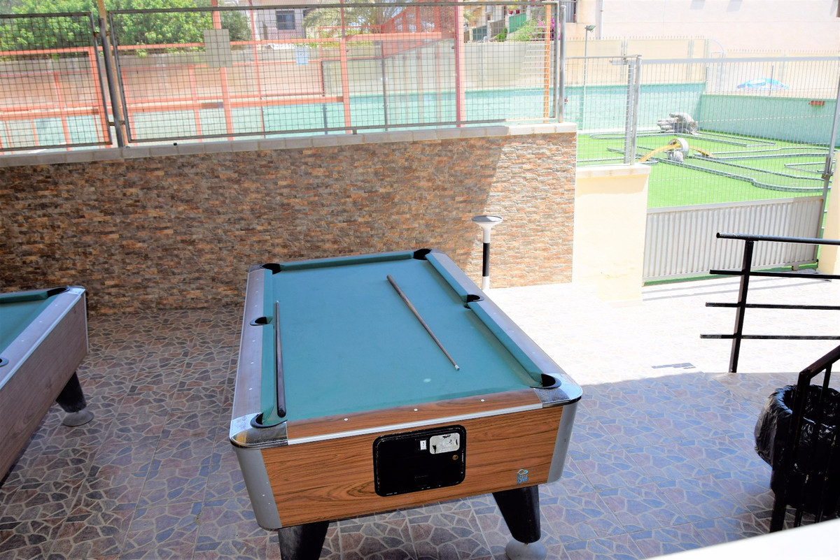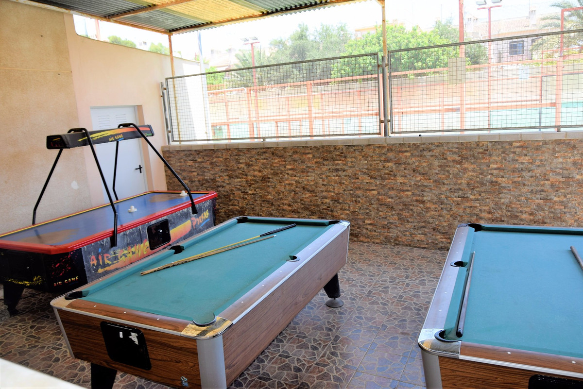 In the bar we find a fully equipped kitchen with stoves, ovens, and all necessary appliances. In addition, it has a warehouse to deposit goods and a large cold room where to keep fresh products with different refrigerators. When leaving the bar you will find the bathrooms, a recreational area with billiards and an outside terrace overlooking the pool.