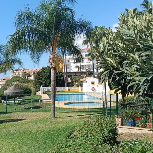 Duplex penthouse located in a rapidly expanding area between Fuengirola and Cala de Mijas (Chaparral-Calaburras golf course area), approximately 300 meters from Playamarina beach and El Charcón. It has 3 bedrooms, 2 bathrooms (one en suite with a hydromassage bathtub and separate shower), two living rooms, one on each floor, a fireplace, and an open-plan kitchen with state-of-the-art furniture. Marble floors and bathroom tiling. Recently renovated hot and cold air conditioning. Two large terraces, one per floor, equipped with sun awnings. The communal areas include gardens and a swimming pool for adults and children. The price includes a garage space and a large storage room