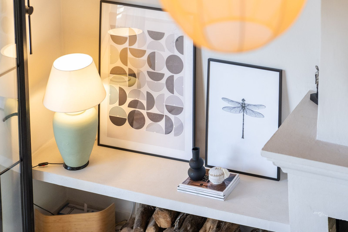 The property welcomes you through a cozy porch entrance, leading into a warm and inviting living room with a fireplace, a guest toilet and a modern open-plan kitchen with a spacious dining area. The entire main floor opens out to an expansive south-facing terrace featuring a dining area, built-in BBQ and views of the Mediterranean Sea—perfect for year-round entertaining.