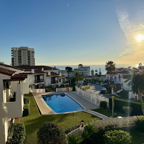 Apartment in the lower part of Riviera del Sol. It has 2 bedrooms and 1 bathroom, a kitchen open to the living-dining room, a large terrace with sea views, and a balcony off the bedroom. Communal pool and gardens. It is located a few meters from bars, restaurants, and supermarkets, and just a few meters from the beach.